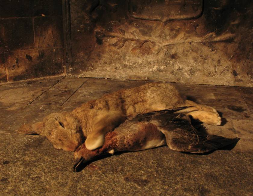 In this series of short videos, dead animals cross the bounds of mortality and become animate objects. Created as a simulacrum of the traditional still life paintings with dramatic natural light and lush amber hues, each video is imbued with the past, yet the dead animals are alive and moving: a rabbit and a duck engage in a post-mortem cuddle, a pigeon fidgets on its back and a sheep’s eye follows the buzzing fly above its head. With the use of skinned fleshy dead animals, these three compositions, or rather decompositions, contemplate the vanity of our existence.