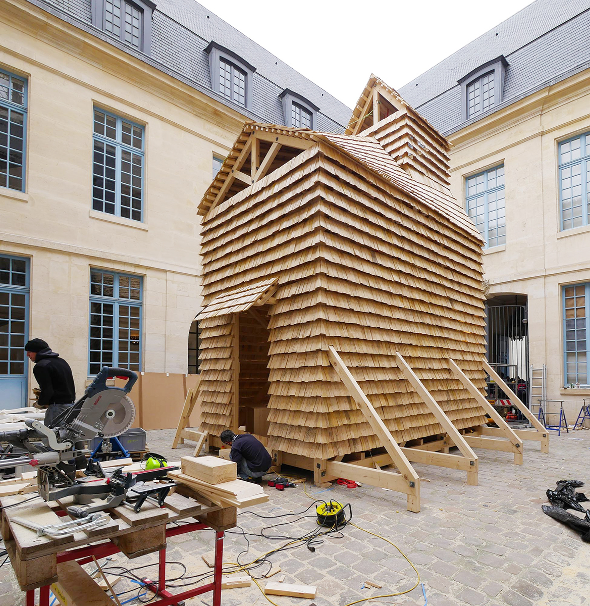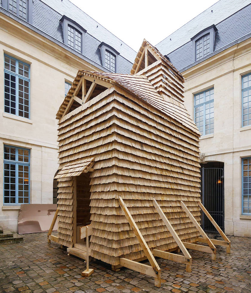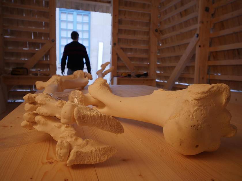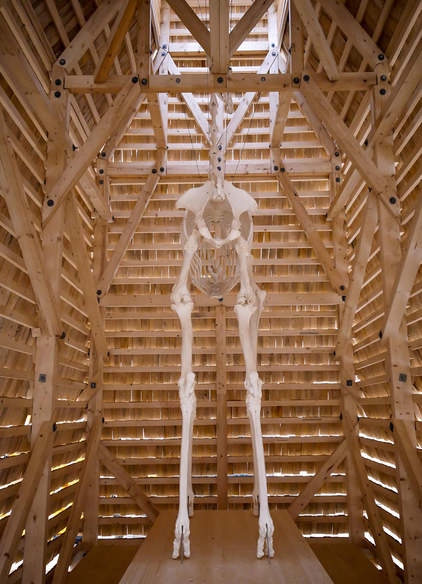 A wooden chapel was built around a Giraffe skeleton. The visitor enters and finds himself between the bones of the animal and the skin of the building. The similarity in morphology between the architecture and the skeleton raises the question, which one came first: the chapel or the girafe?