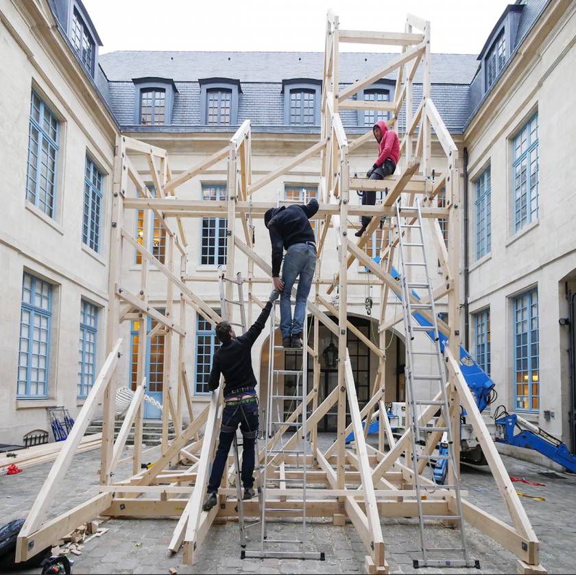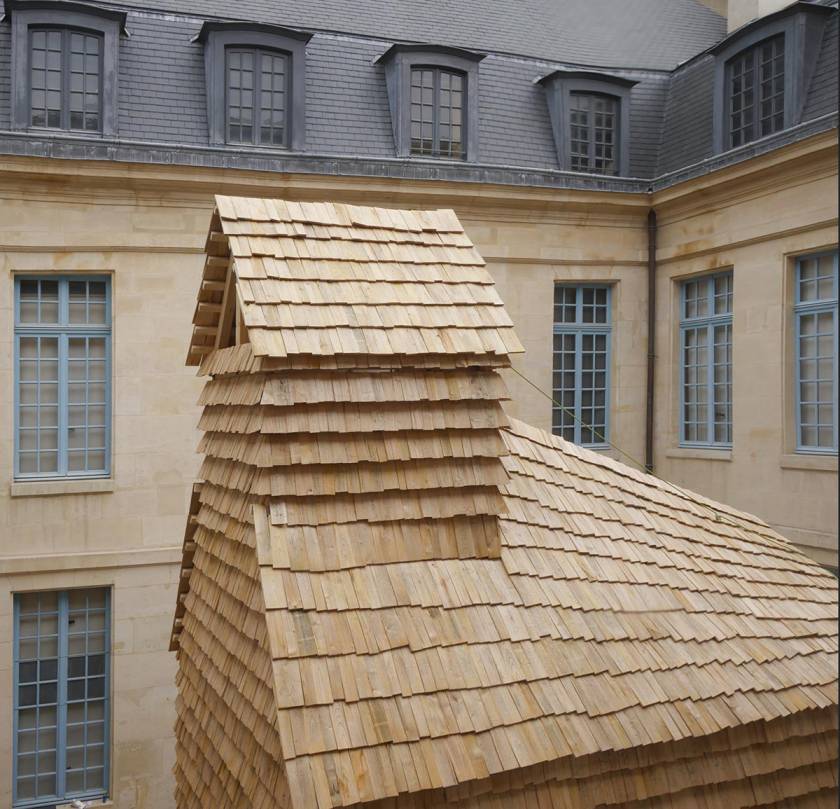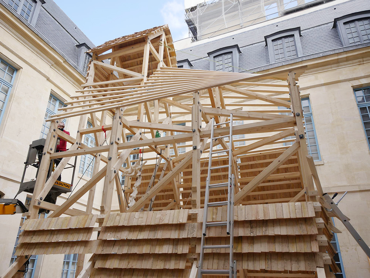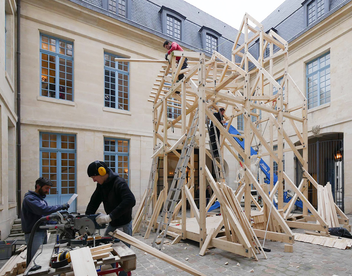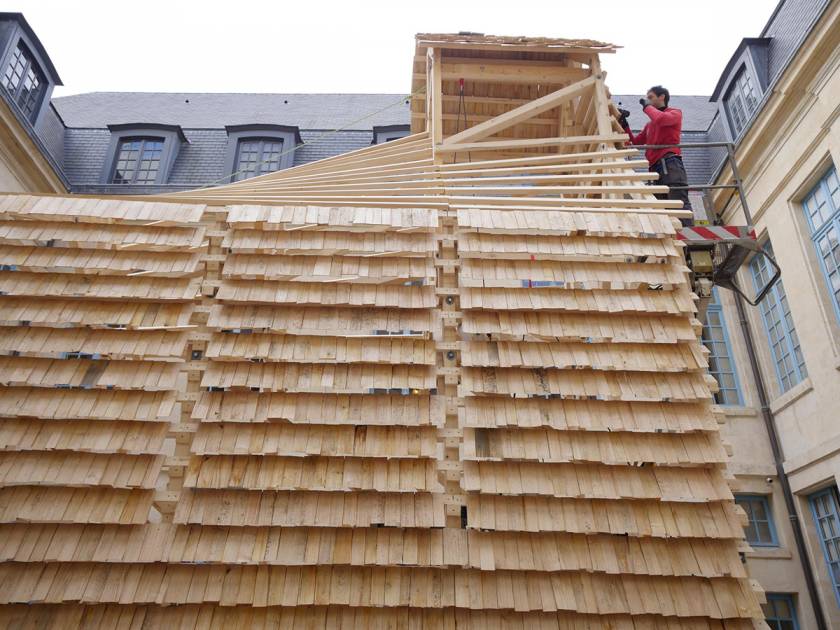 A wooden chapel was built around a Giraffe skeleton. The visitor enters and finds himself between the bones of the animal and the skin of the building. The similarity in morphology between the architecture and the skeleton raises the question, which one came first: the chapel or the girafe?