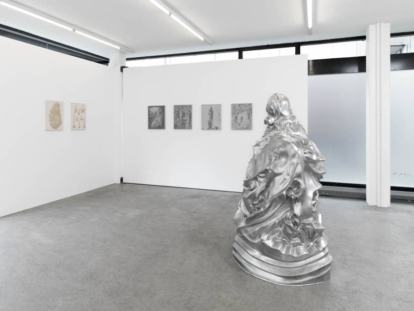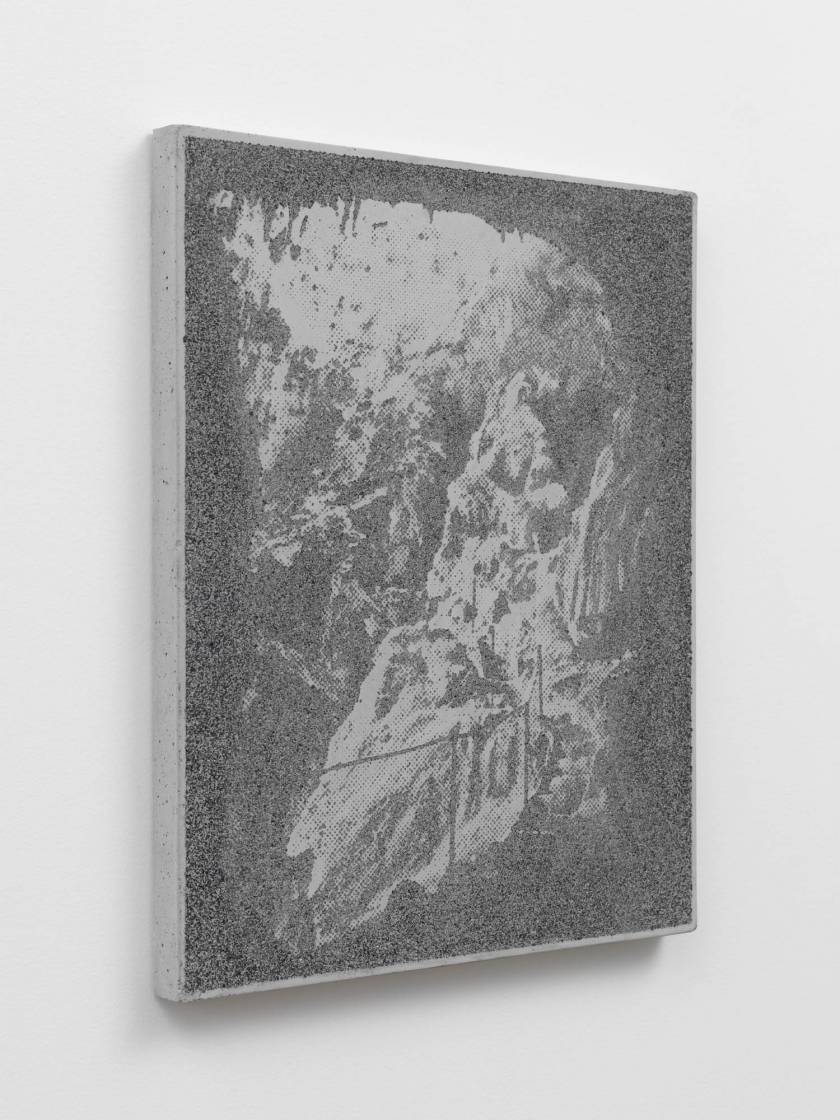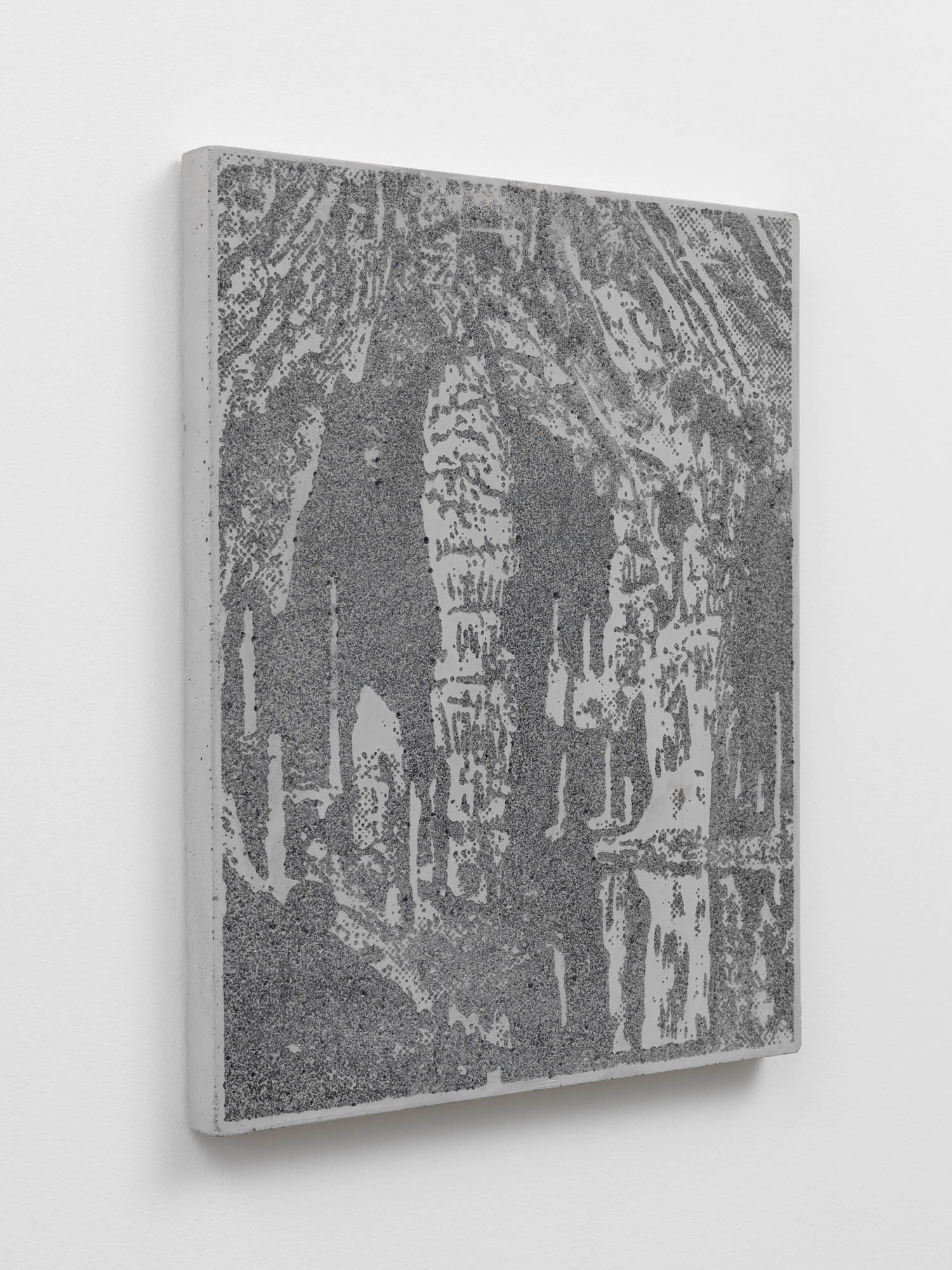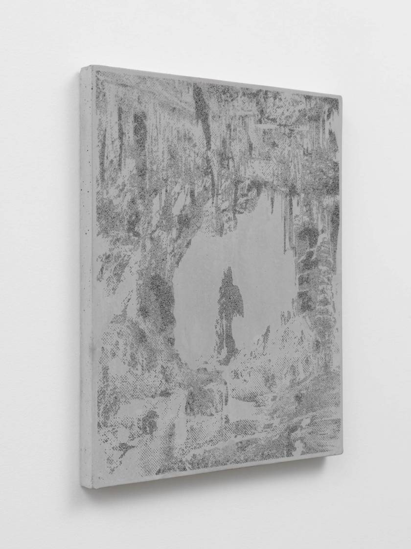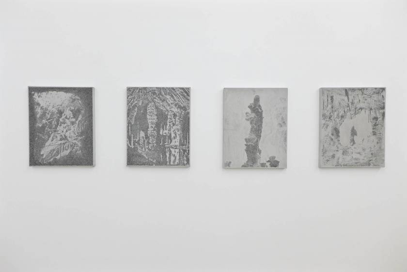Des objets et des lieus issus d’origine minérale sont chargées de sens par leur forme suggestive. La grotte devient une cathédrale, une stalagmite est adorée comme une madone, des concrétions collectionnées comme des reliques. Quand la forme précède le sens. Et ce sont ces formes que l’artiste a transféré sur des plaques de béton comme des plaques photographiques par un procédé d’acidage qui ronge le ciment pour faire apparaître l’image. Les grains de sables du mortier deviennent les pixels des photos.