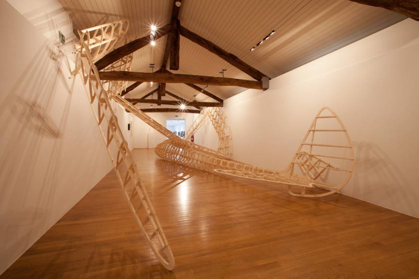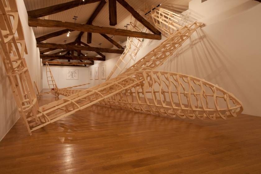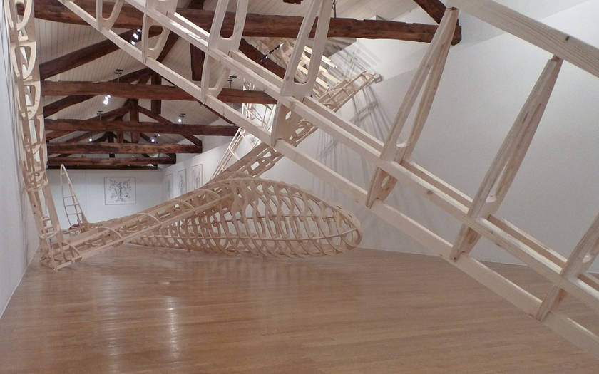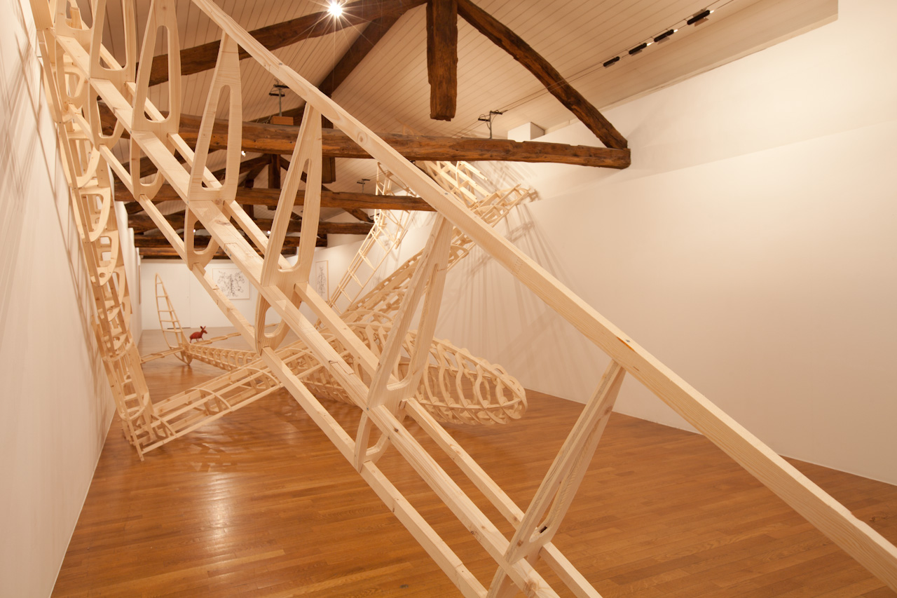 Name of a dragon in Norse mythology, Fafnir is also the name of a glider that was constructed in wood in Germany in the 1930s. Since, at one point, it was launched with an elastic at the top of the Jungfrau in Switzerland. The aerodynamic aircraft – recreated by enlarging a model to its original scale – is 20 meters wide and recalls the refined elegance of design of its time.  In a precarious attempt to land inside a narrow confinement of a building, the structure has undergone an unfortunate contortion causing disfigurement and entrapment like a poor insect that either outgrew the space or got stuck in a hole too small to free itself.