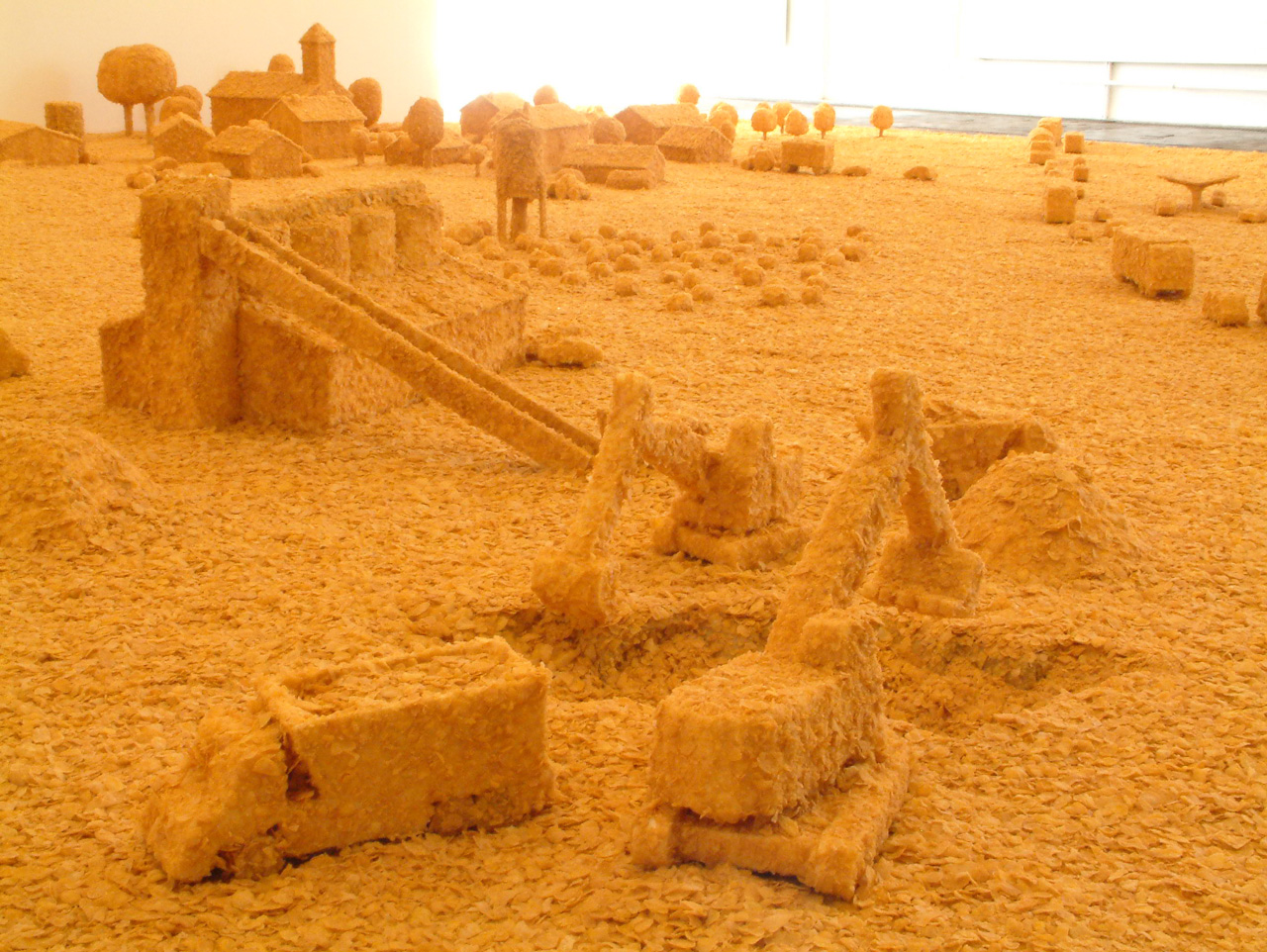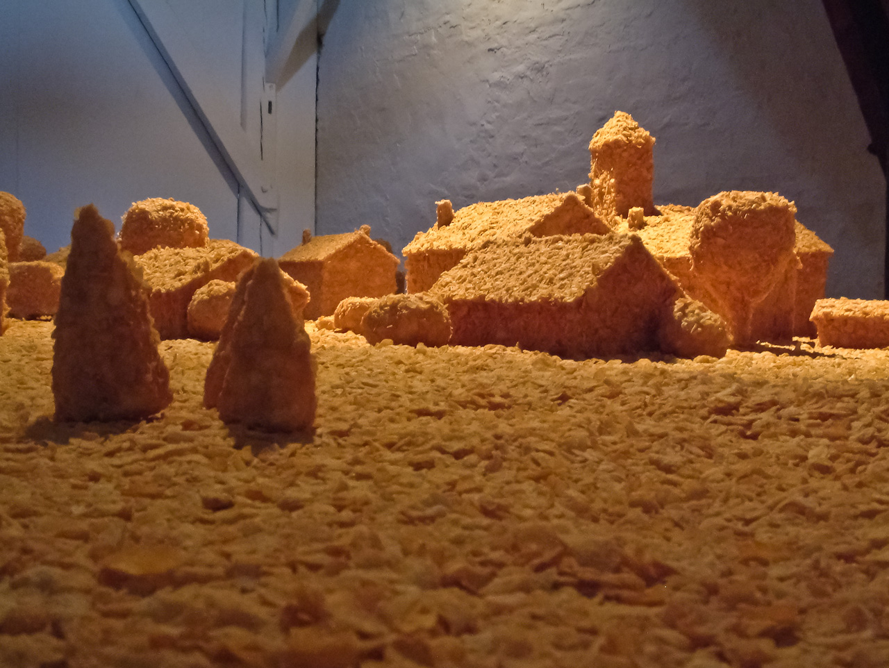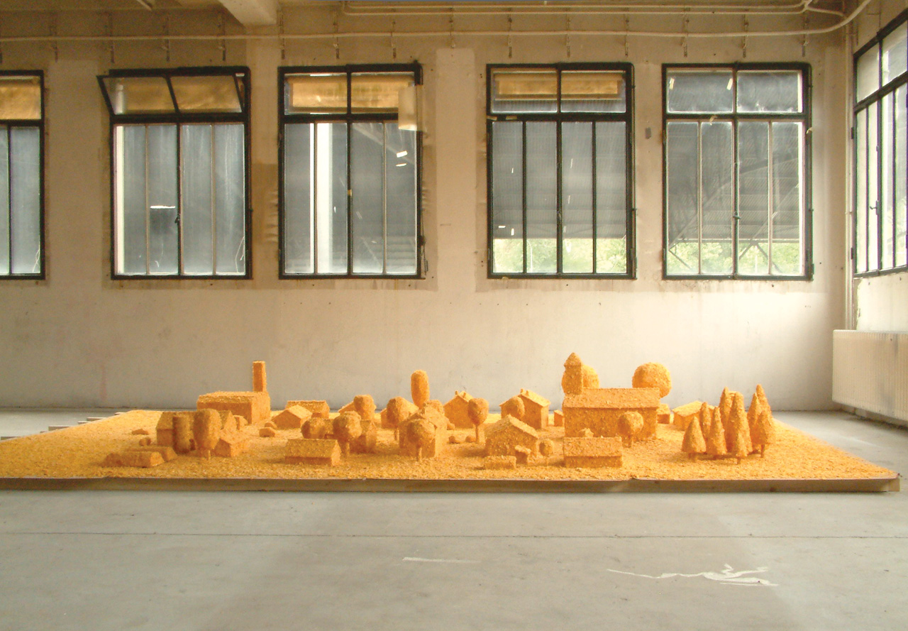 Taking a contrarian position to the axiom, “Do not play with food,” Flakes Town, a monochrome installation, is exclusively realized in and dotted with cornflakes. One can ask, “Is it better to drink out of a biodegradable glass made of corn or build an imaginary village with 300 kilograms of corn?” which then leads to another set of questions about what is food when it can be plasticized, turned into fuel and transformed into a base material. But sociobiological ponderings aside, Flakes Town also retains a storybook element of fantasy reminiscent of Hansel and Gretel who discovered a gingerbread house with windows of candy.