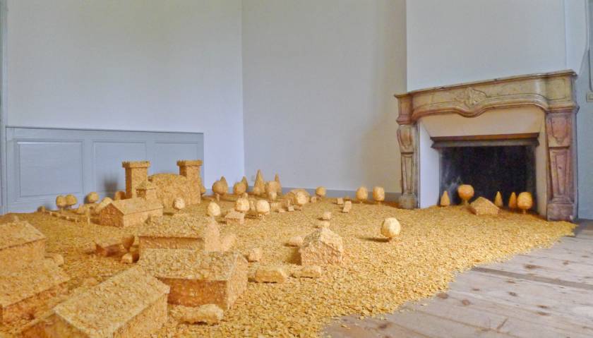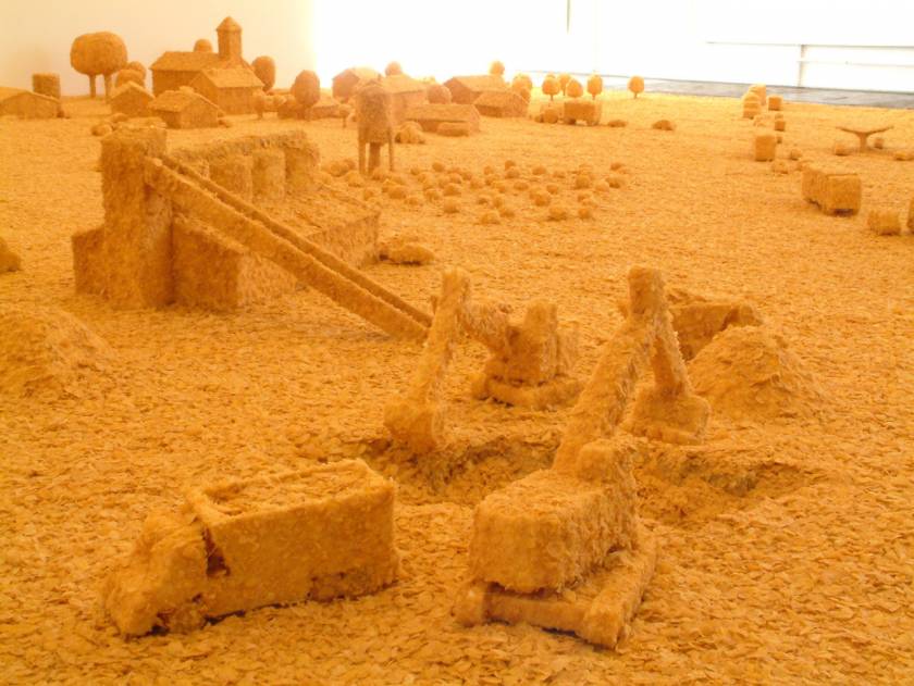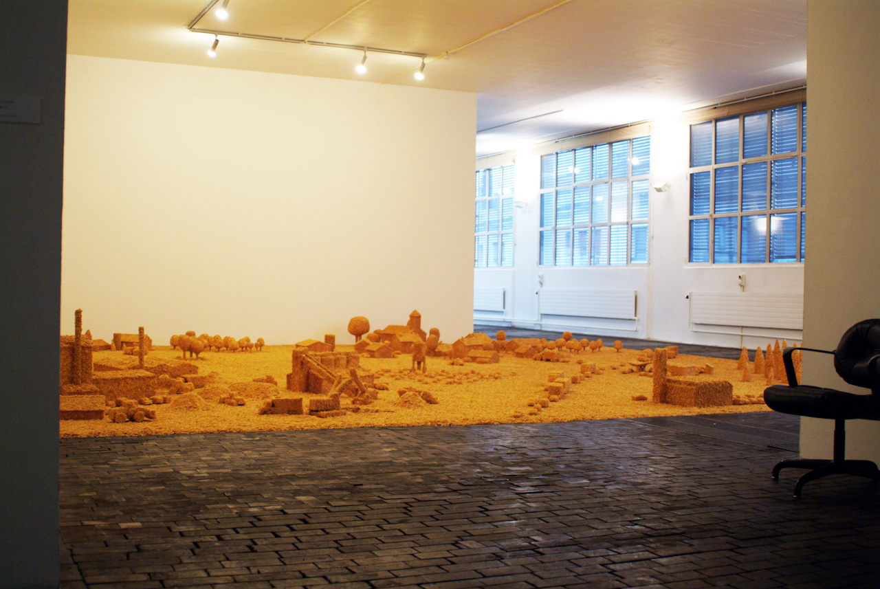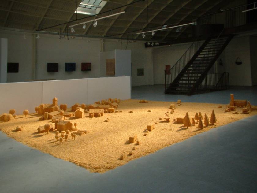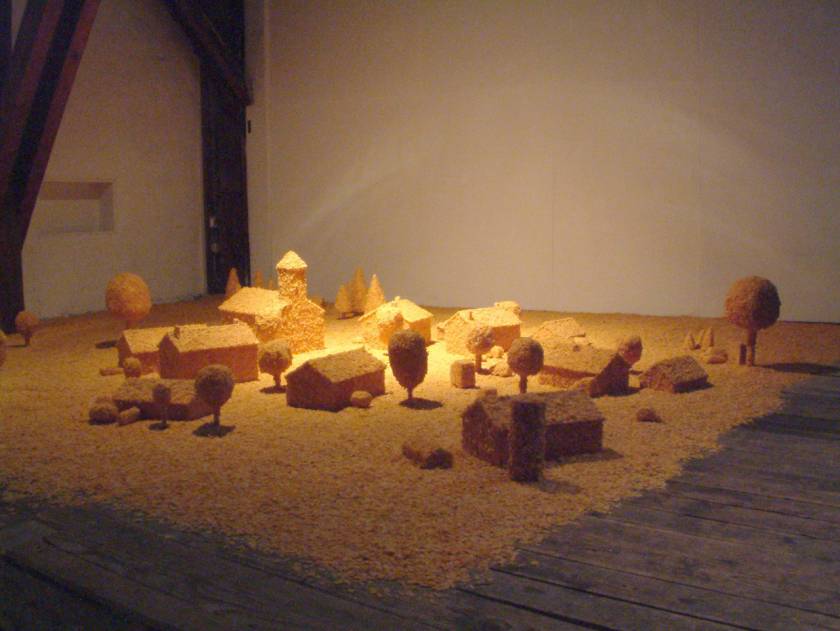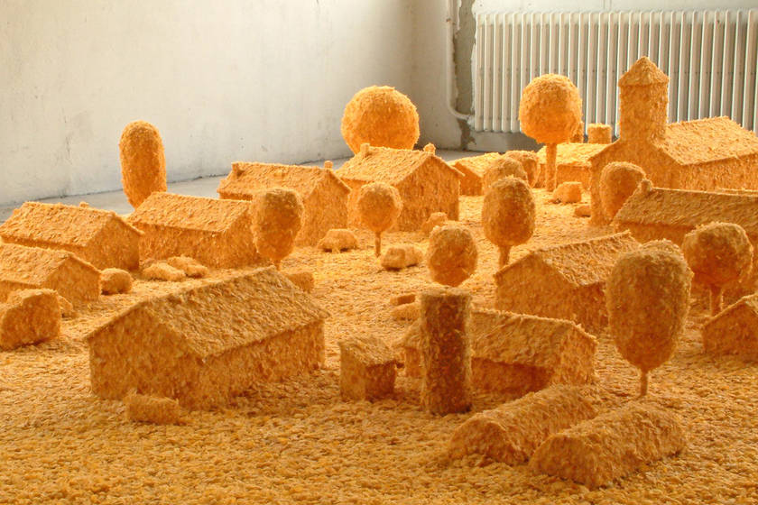 Taking a contrarian position to the axiom, “Do not play with food,” Flakes Town, a monochrome installation, is exclusively realized in and dotted with cornflakes. One can ask, “Is it better to drink out of a biodegradable glass made of corn or build an imaginary village with 300 kilograms of corn?” which then leads to another set of questions about what is food when it can be plasticized, turned into fuel and transformed into a base material. But sociobiological ponderings aside, Flakes Town also retains a storybook element of fantasy reminiscent of Hansel and Gretel who discovered a gingerbread house with windows of candy.