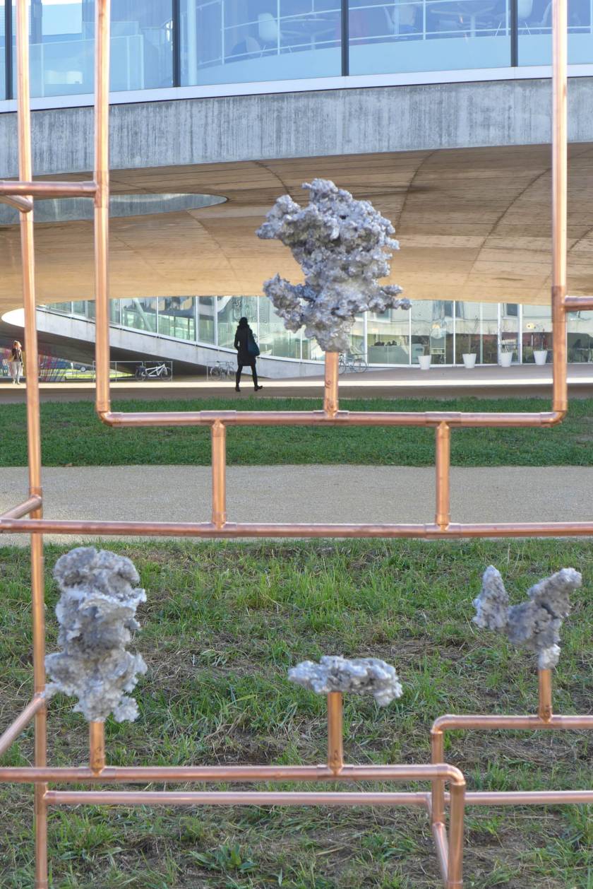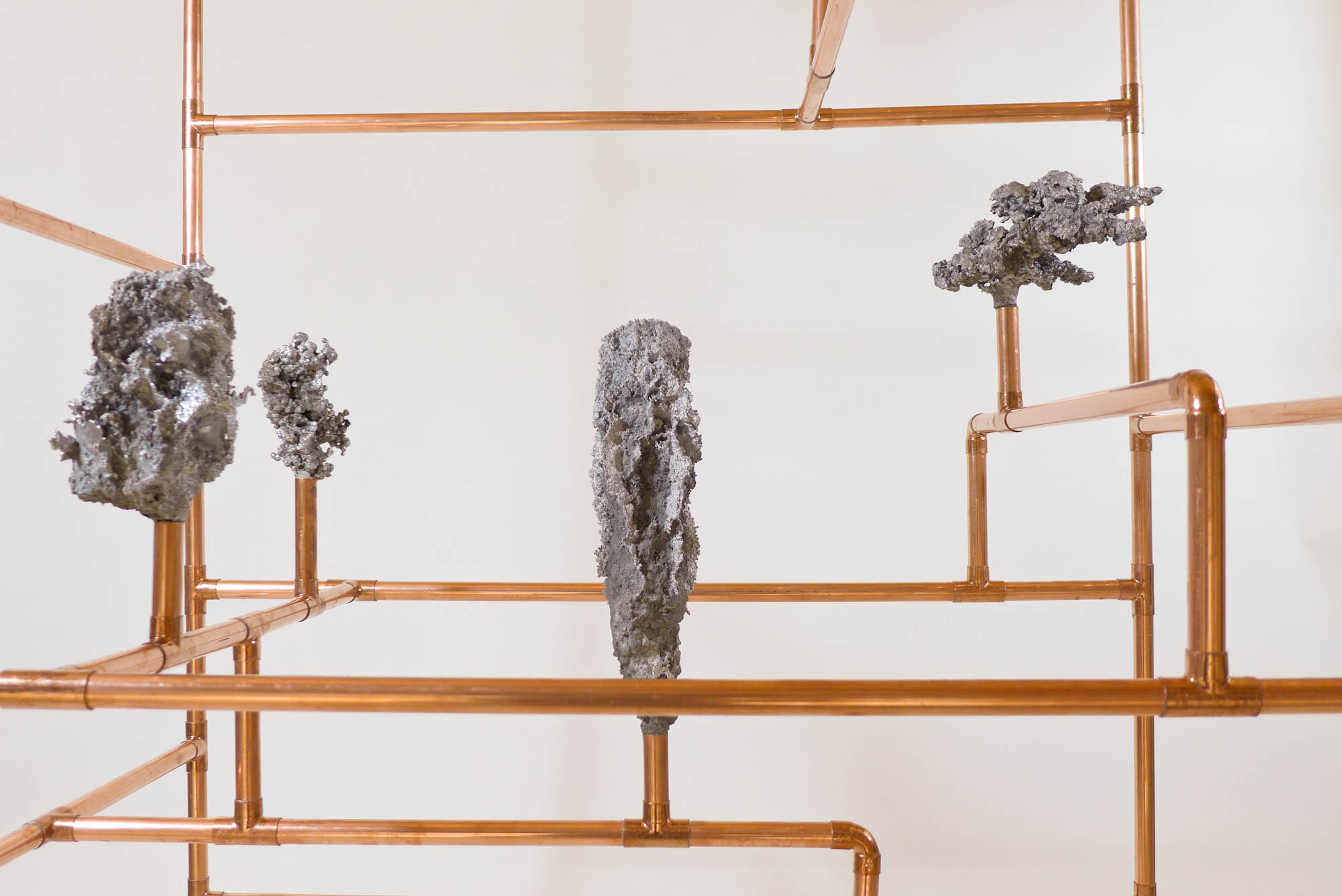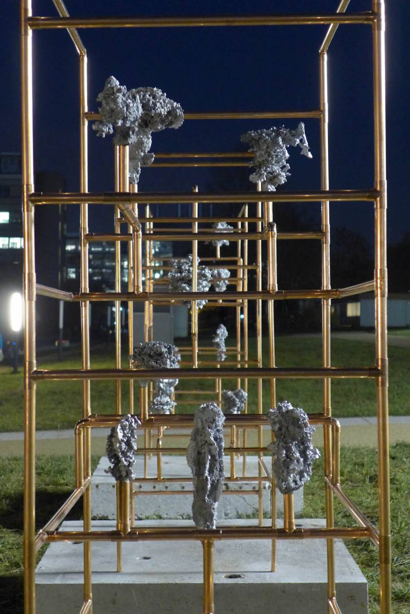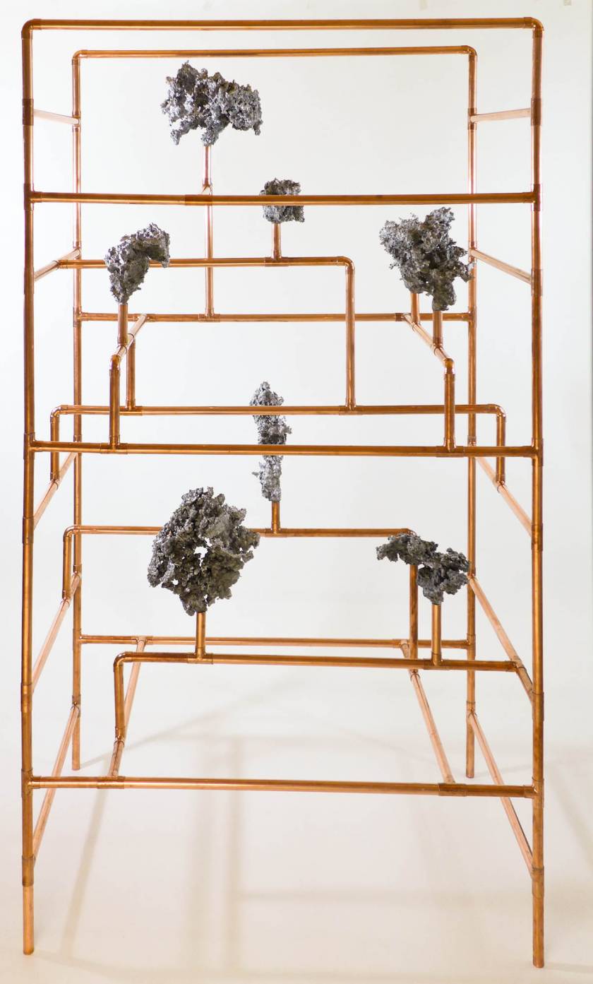 Looking for the origin of natural forms, Gonzenbach tries to materialize the propagation of a liquid by casting melted aluminum into different sands. The petrified clouds of metal are presented in Chinese cabinet shaped copper tubular structures.