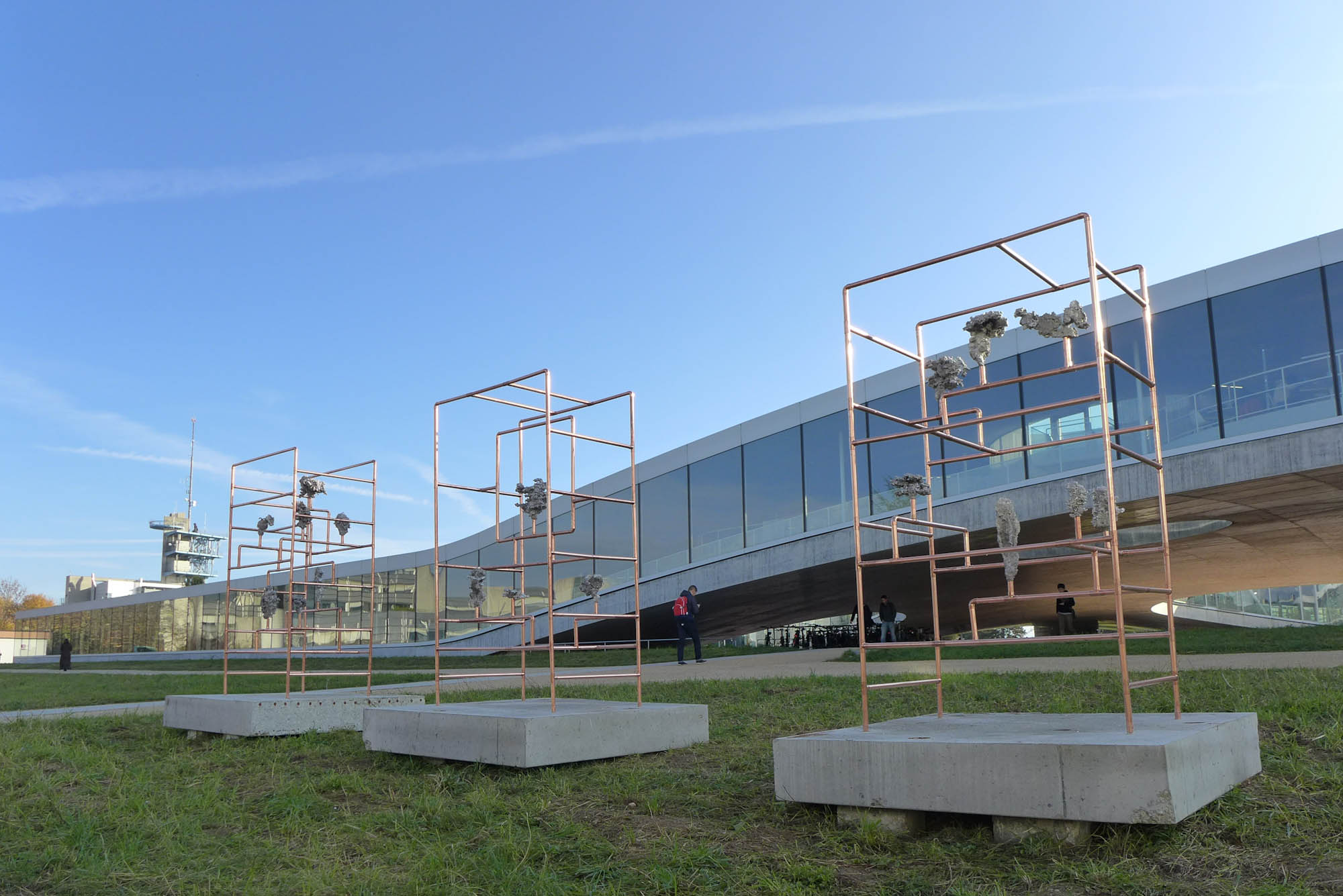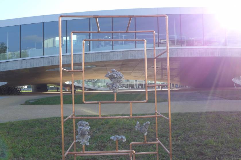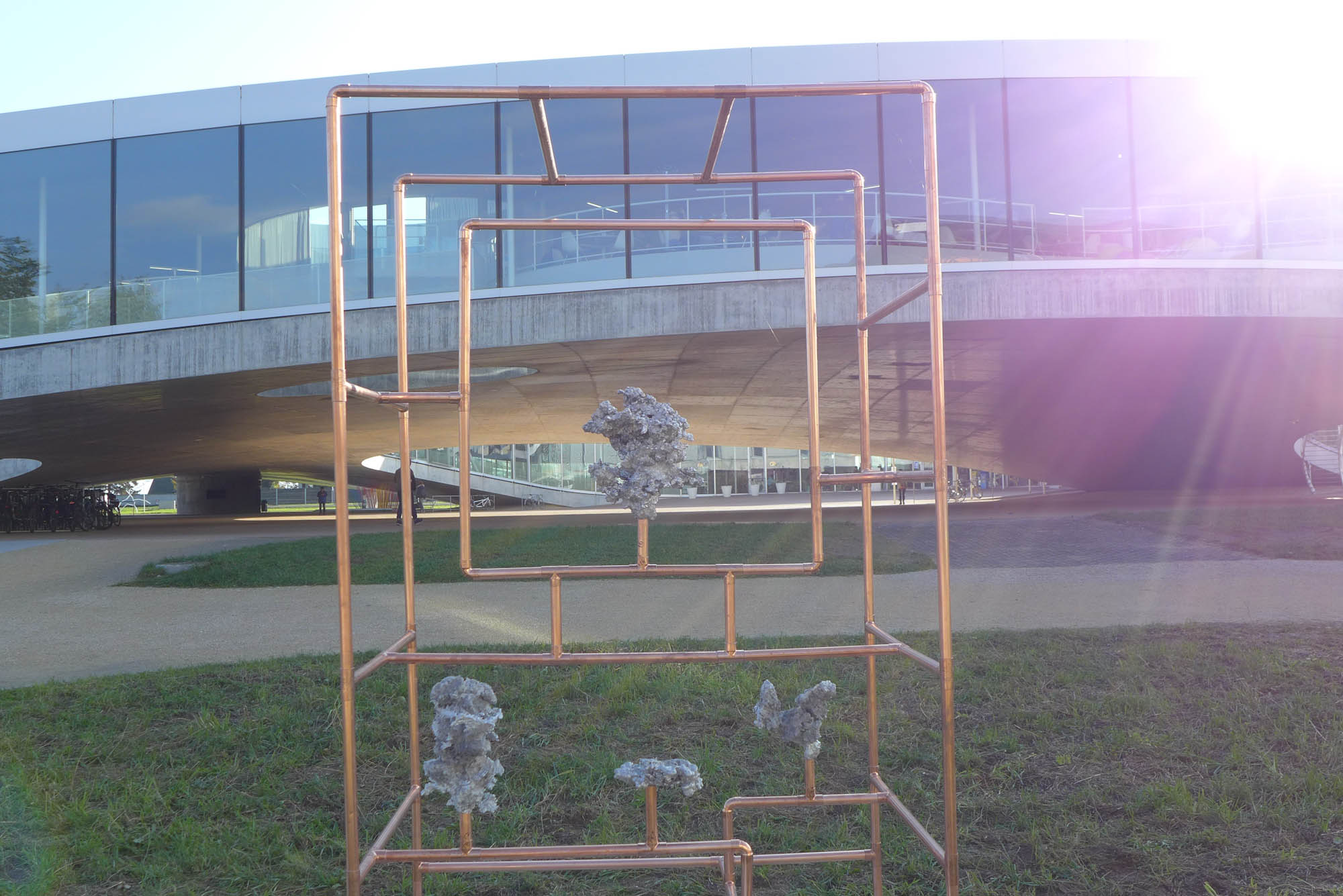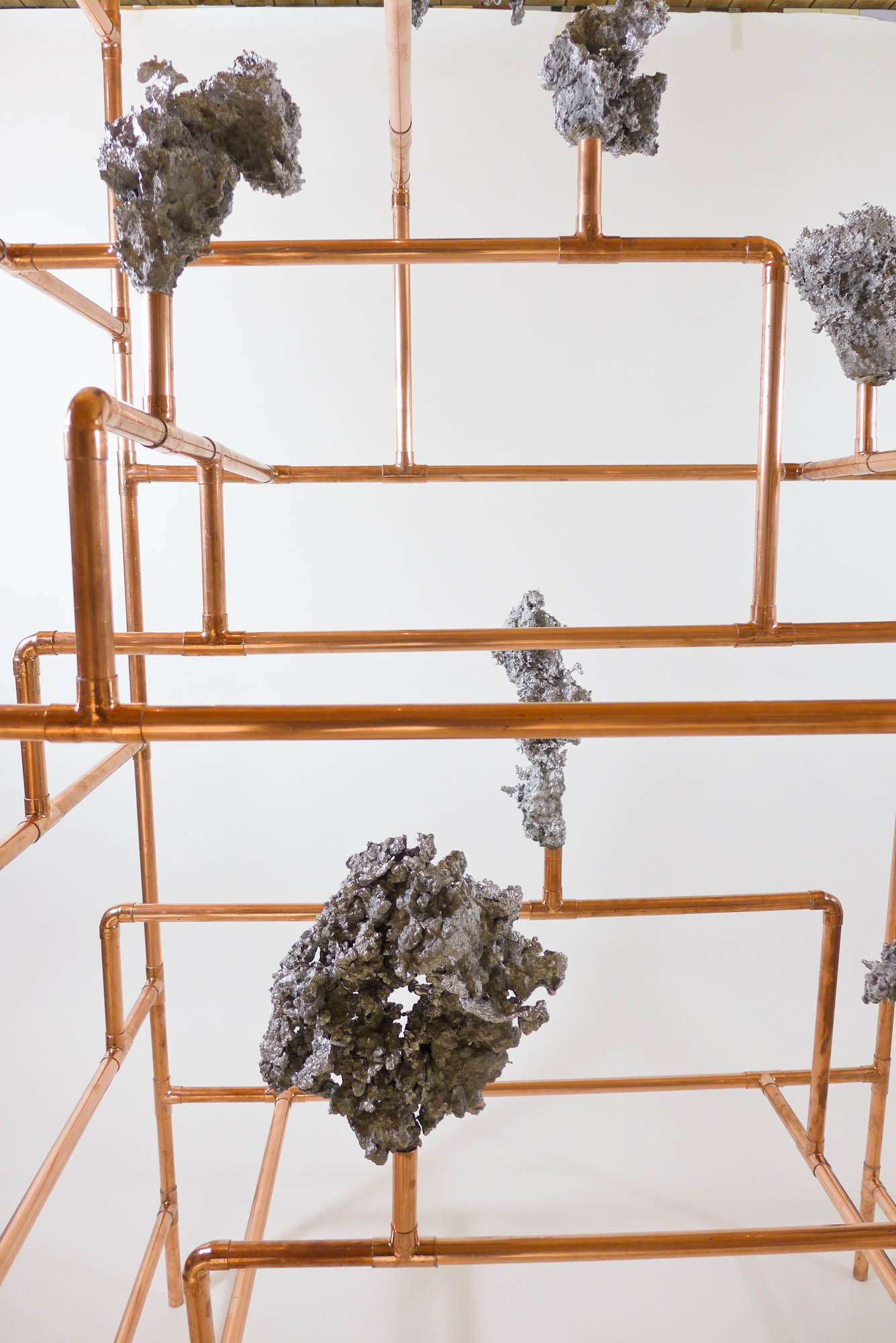 Looking for the origin of natural forms, Gonzenbach tries to materialize the propagation of a liquid by casting melted aluminum into different sands. The petrified clouds of metal are presented in Chinese cabinet shaped copper tubular structures.