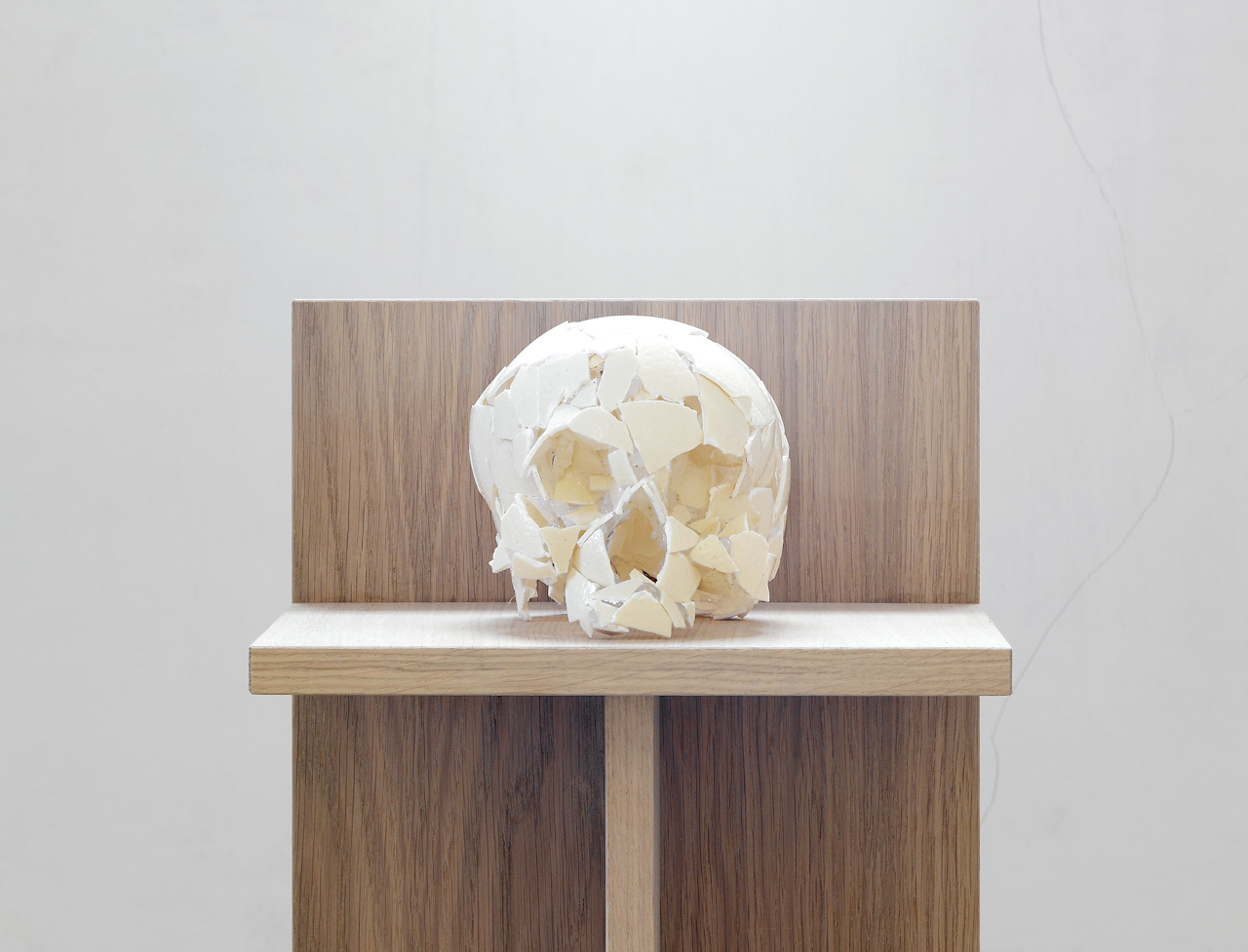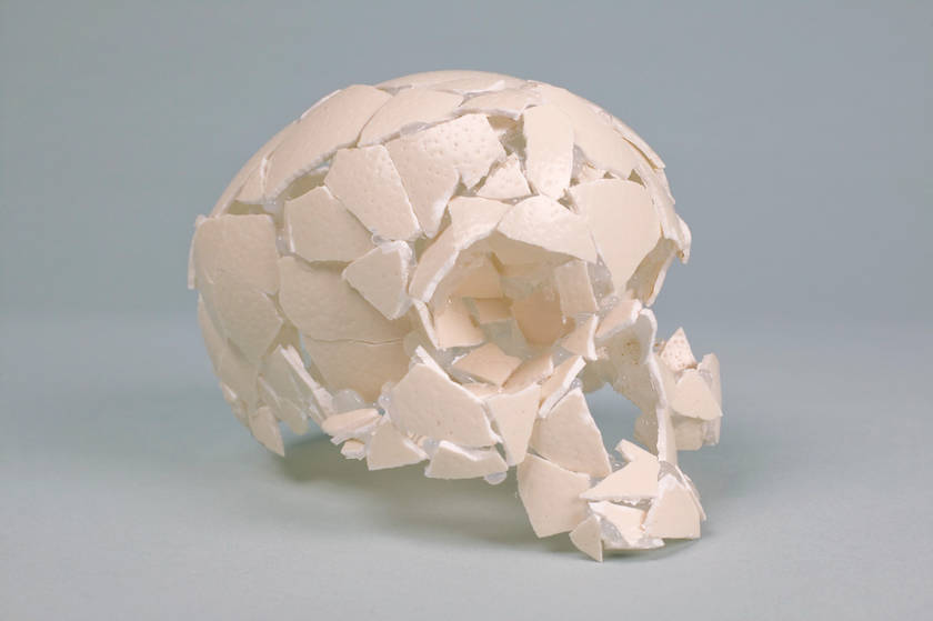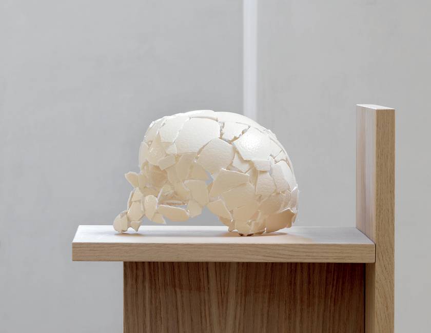 An ostrich egg and a human skull share roughly the same weight and volume, and similar material and color, yet they symbolize totally opposing states – one beginning of life, the other end of existence. The collision of the two iconic objects of birth and death immediately shatters the gap between the beginning and the end, and results in symbiotic co-existence. The presumed bird is yet to break out of the egg, but the perfectly reconstituted fragmented eggshells in the shape of a skull conjures up a notion of eternal confrontation with death. By examining the fragility of the process it explores the theme of mortality and vanity.