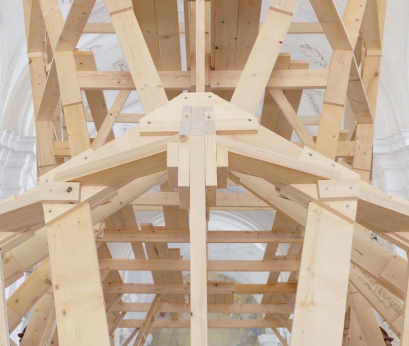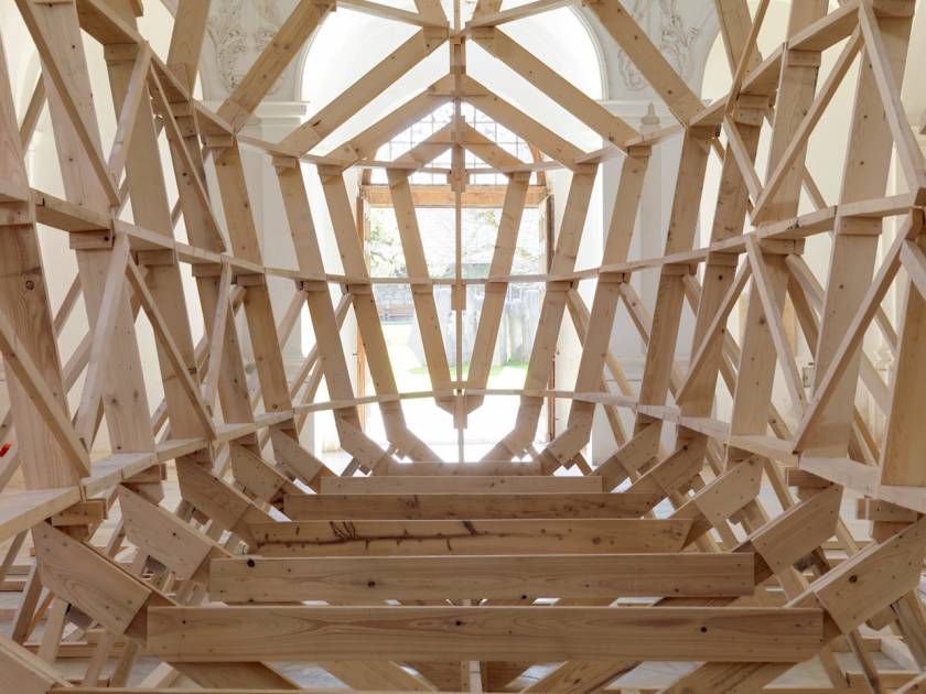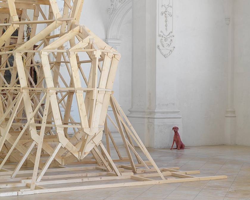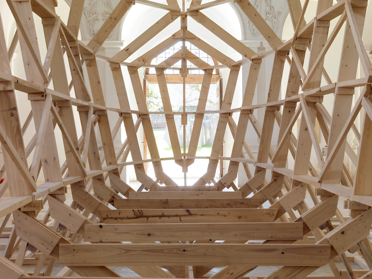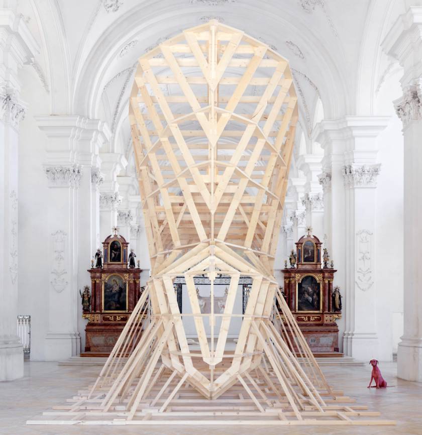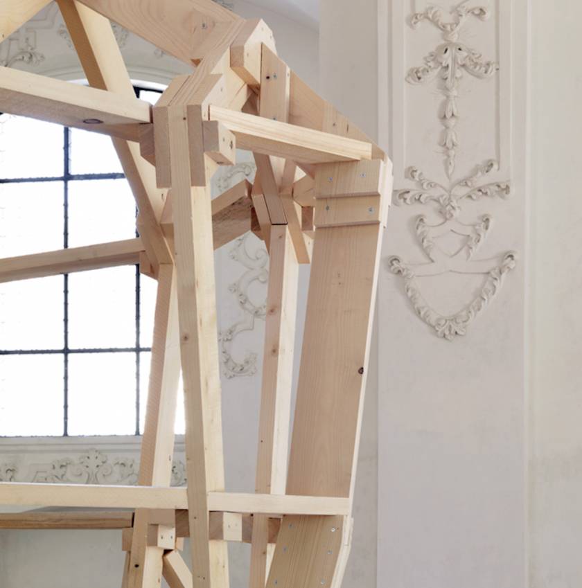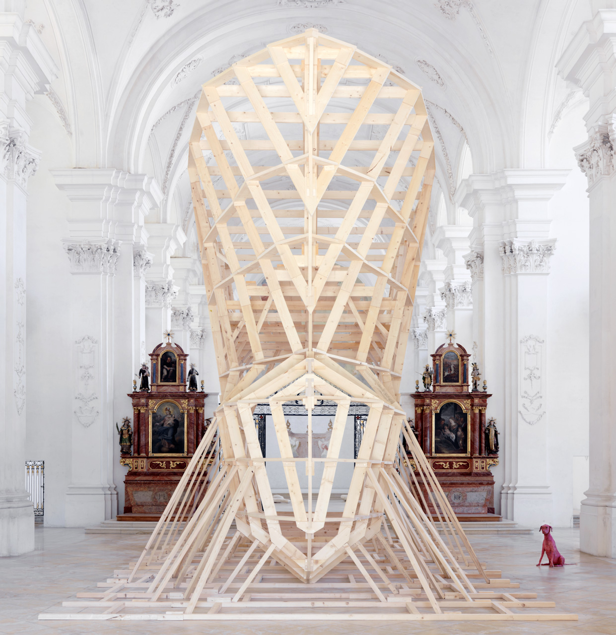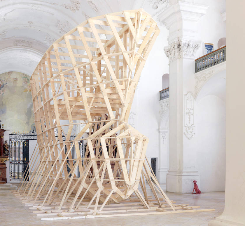 A site-specific work erected in the nave of Bellelay Abbey, which is now a psychiatric clinic, in the Bernese Jura, Switzerland, the structure mimics the front portion of the ship – or la nef – thus becoming a play on words, as well as space and function. The hand-made structure in wood calls to mind scaffolding and works as a metaphor for something vulnerable, raw and temporal as it oscillates between something finished and unfinished against the environment it situates itself in. Construction within construction, the piece opens up many different possible interpretations such as, a giant face of an animal, Noah’s Ark, a future voyage, a new discovery, etc. And through the large-scale and complex volume it responds to the surrounding architecture and the context.