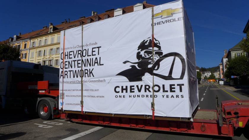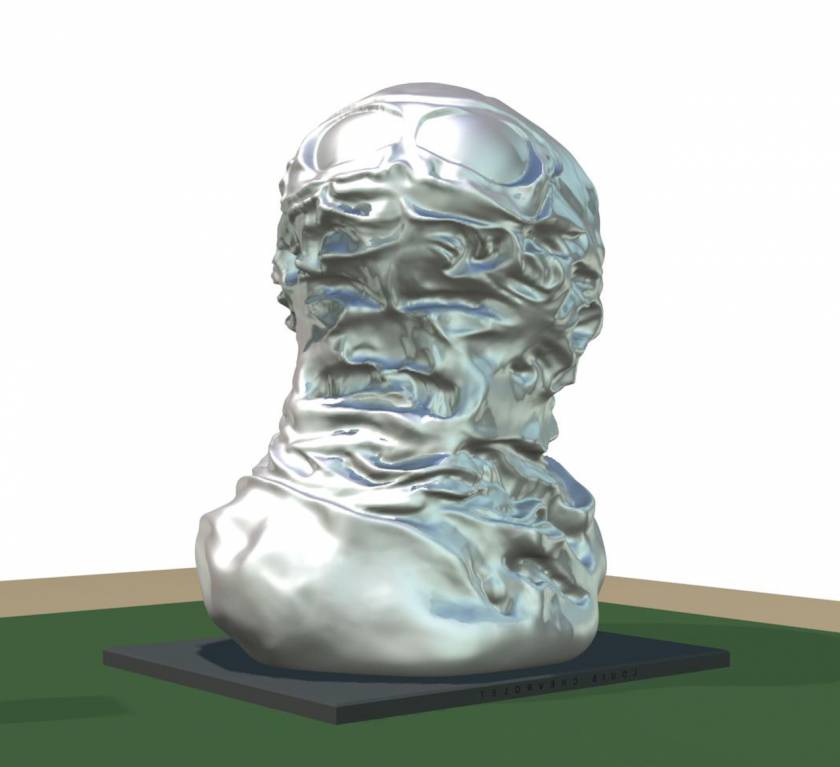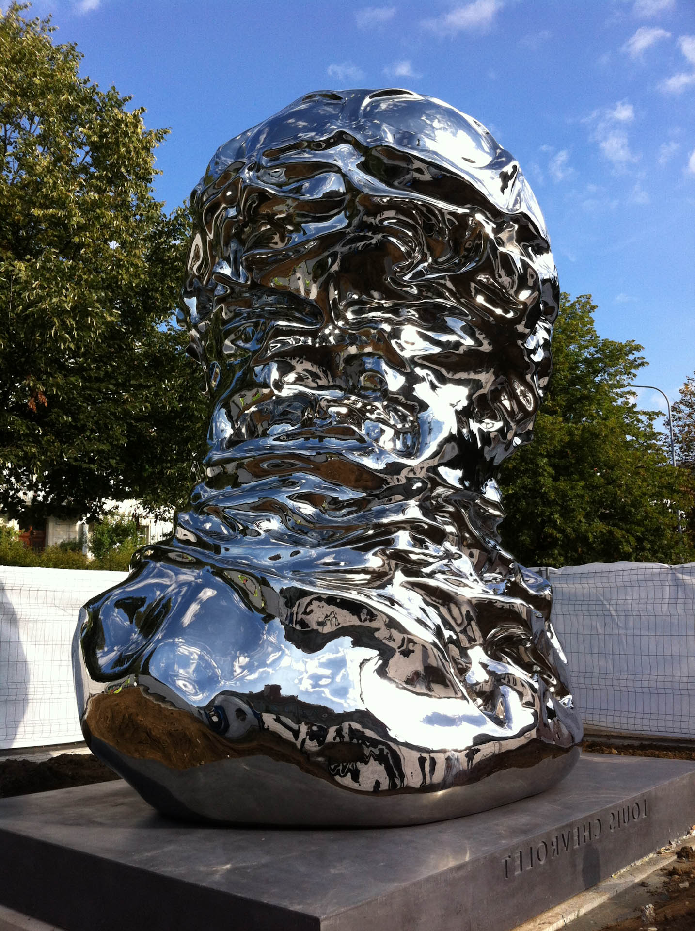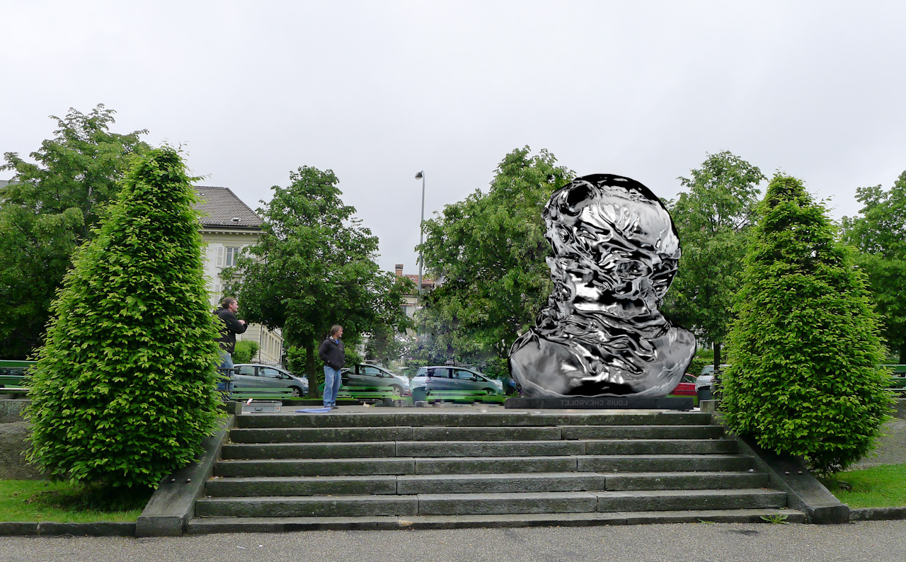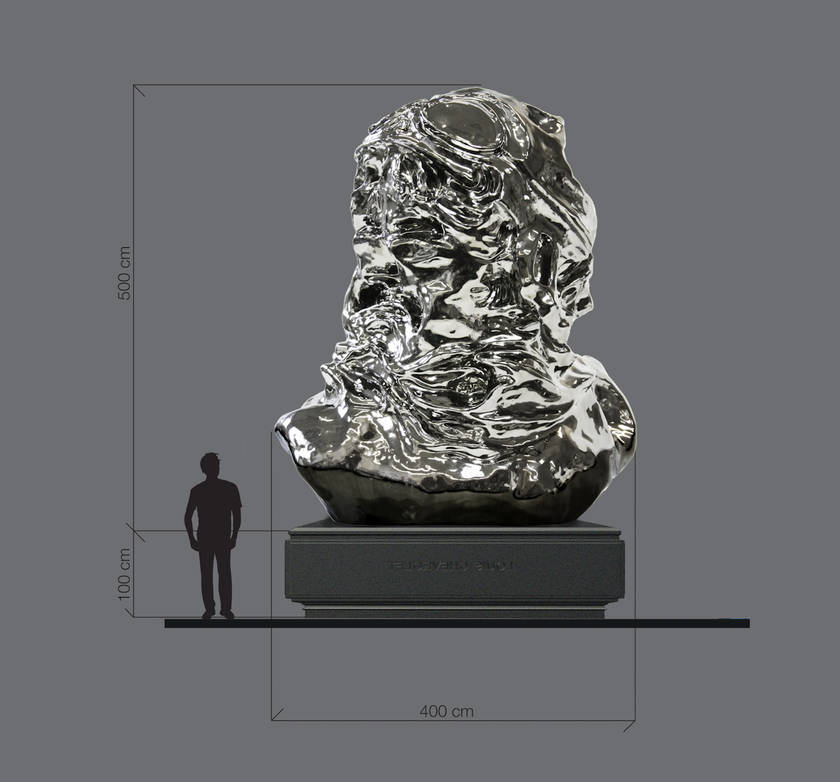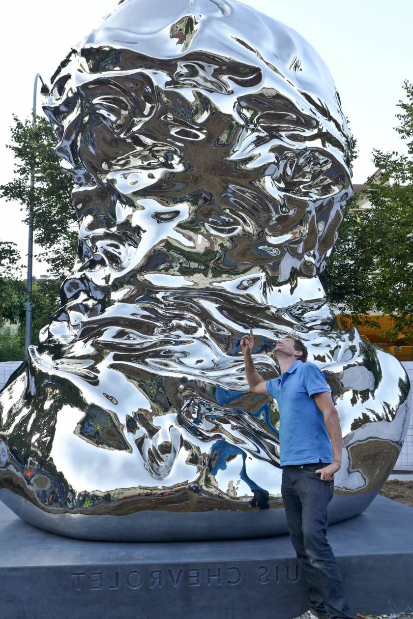 the town of La Chaux-de-Fonds, Switzerland, Chevrolet’s birthplace. As the winner of this prestigious event, Christian Gonzenbach used a photograph of Mr. Chevrolet (with driving goggles and scarf no less) as a starting point and rendered the image as a 3D model. He then reworked the surface with a silicone mold, in turn making the famous man unrecognizable and demanding an endured inspection to discover the figure behind the surface. The process resulted in a form that is as mysterious and complicated as the man whose legacy was unforeseeable even by Chevrolet himself. The final sculpture is constructed in stainless steel which is then mirror polished – a fitting homage to the man who held a close relationship with the material during his remarkable lifetime.