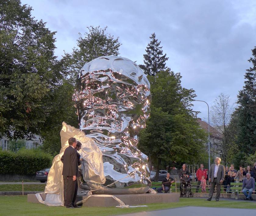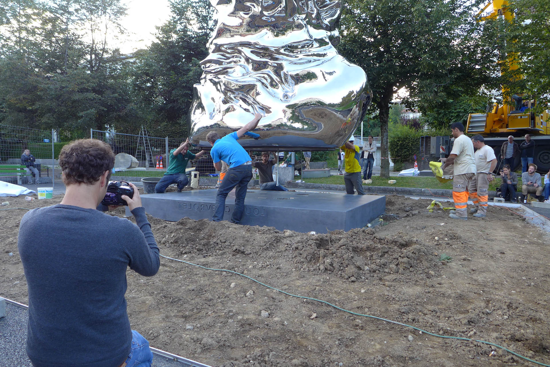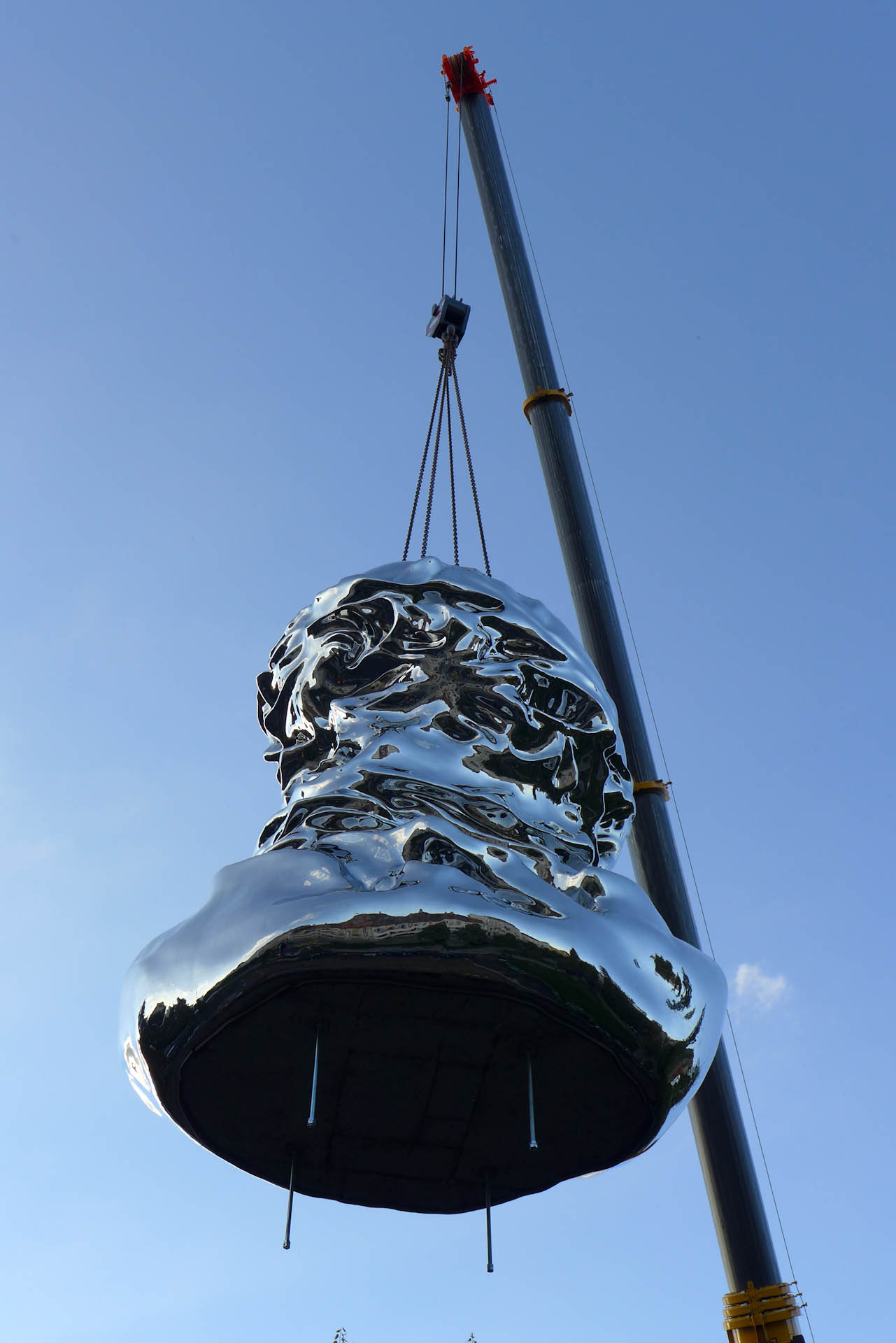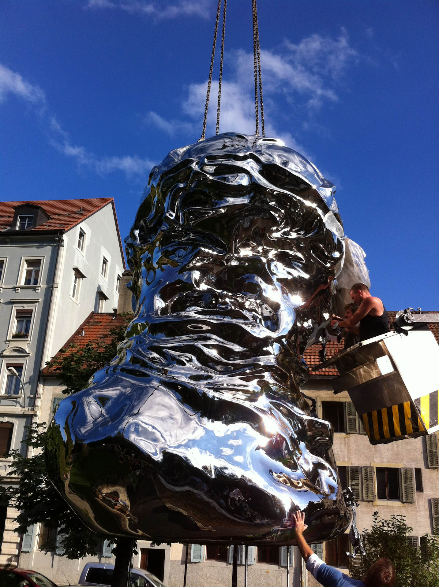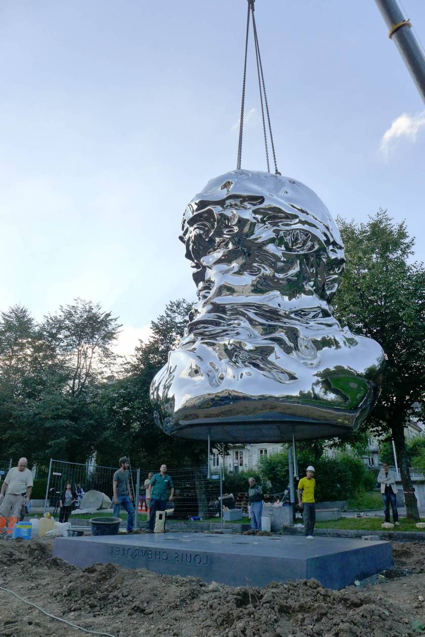 the town of La Chaux-de-Fonds, Switzerland, Chevrolet’s birthplace. As the winner of this prestigious event, Christian Gonzenbach used a photograph of Mr. Chevrolet (with driving goggles and scarf no less) as a starting point and rendered the image as a 3D model. He then reworked the surface with a silicone mold, in turn making the famous man unrecognizable and demanding an endured inspection to discover the figure behind the surface. The process resulted in a form that is as mysterious and complicated as the man whose legacy was unforeseeable even by Chevrolet himself. The final sculpture is constructed in stainless steel which is then mirror polished – a fitting homage to the man who held a close relationship with the material during his remarkable lifetime.