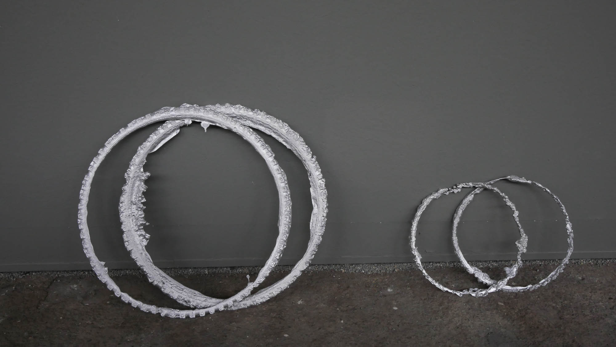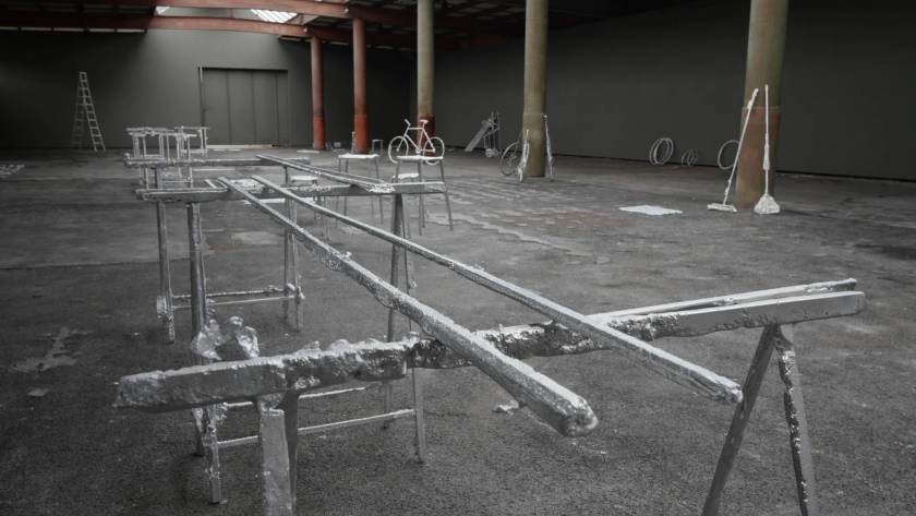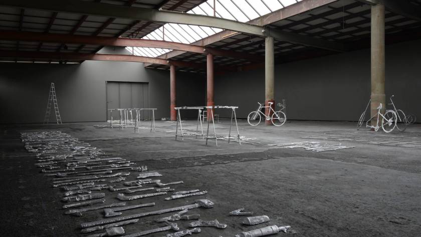 Little by little new shapes appear, first single objects, mainly tools. Then, from those ghost tools, he makes more complex imprints, making more complex objects.