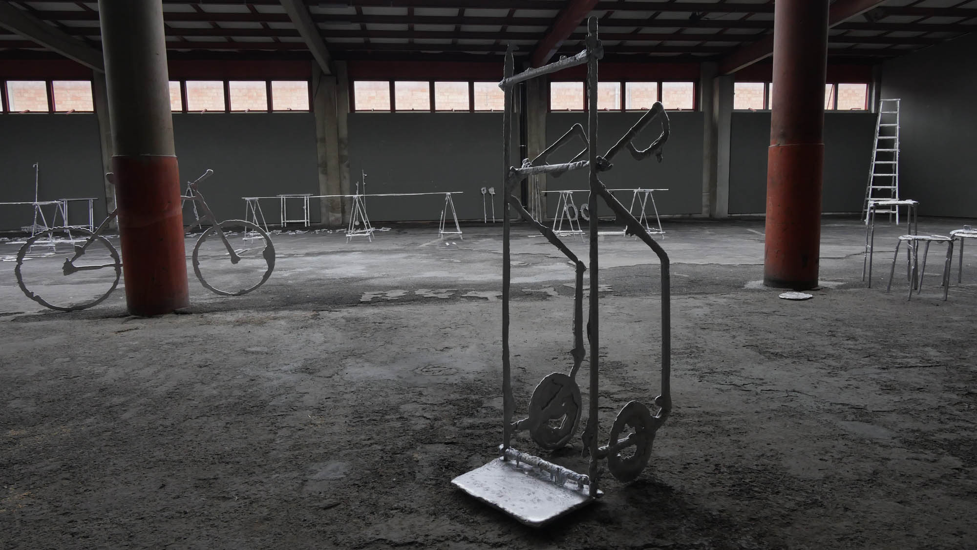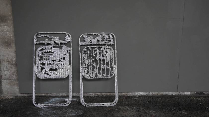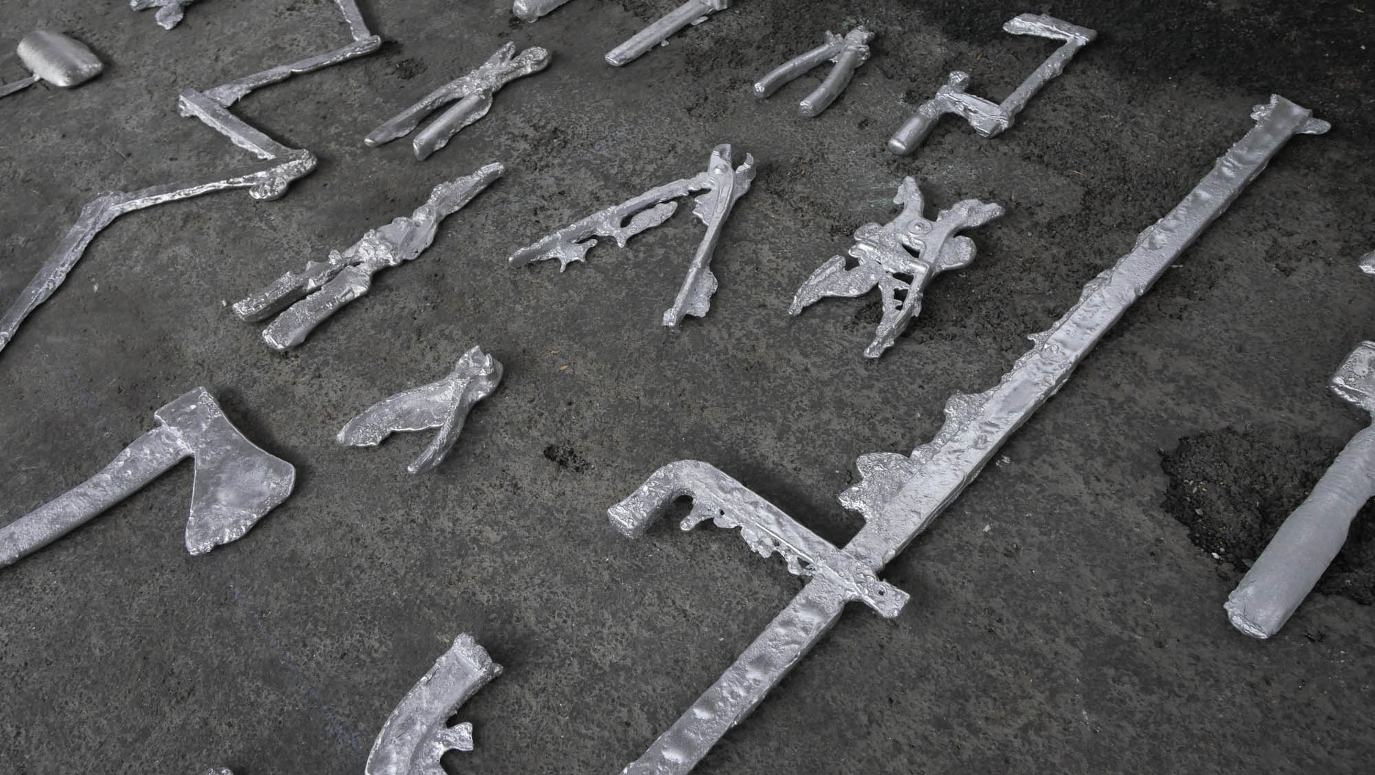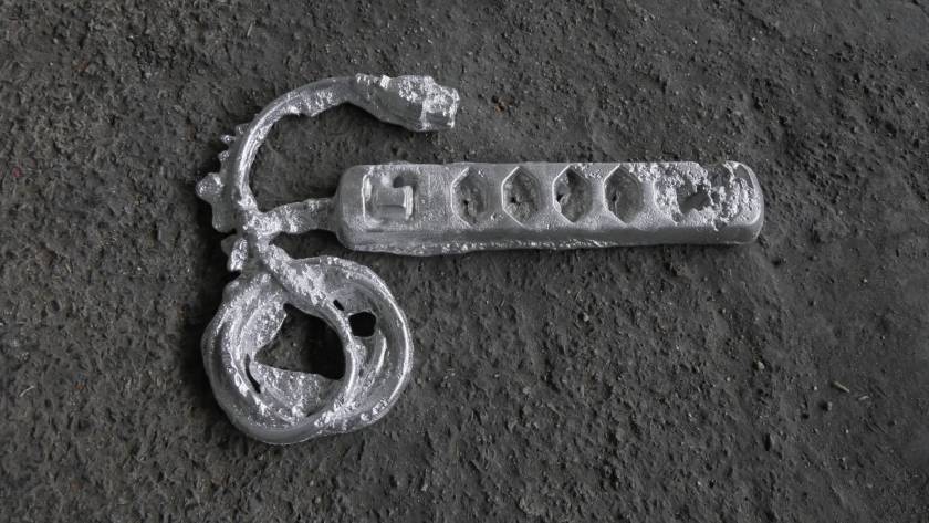 Then he heats the furnace, melting aluminum. With liquid aluminum, he carefully fills the imprints in the sand. Remaking those lost objects is like summoning ghosts. The ghosts of the tools, the ghosts of the workshop.