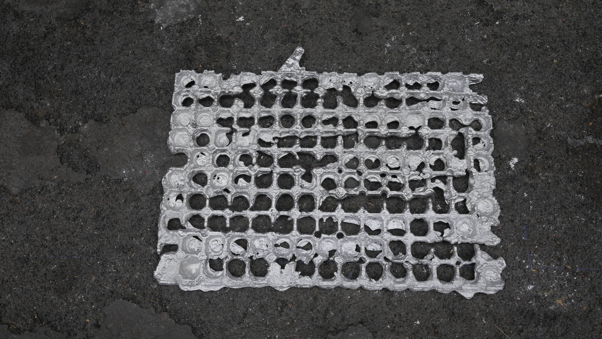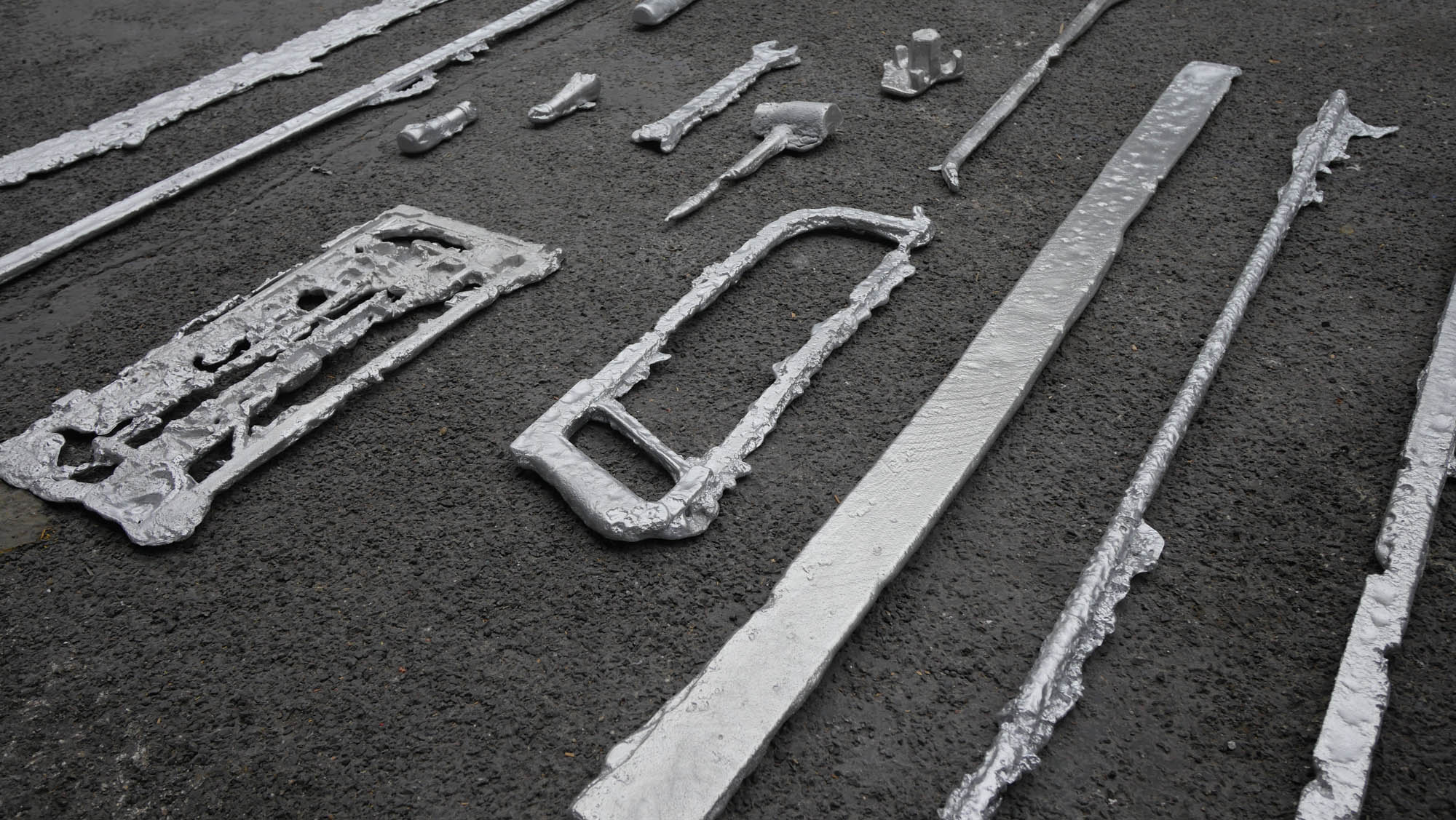 Using the sand, he makes imprints of the leftovers. A piece of wood, a nail, maybe even a single shoe.
