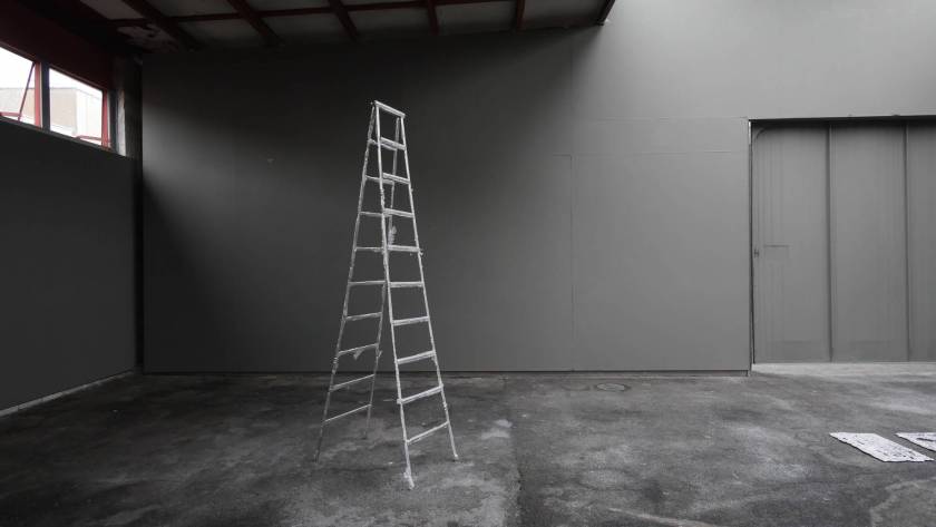 Someone could recognize a table, a working bench, a ladder on the wall.