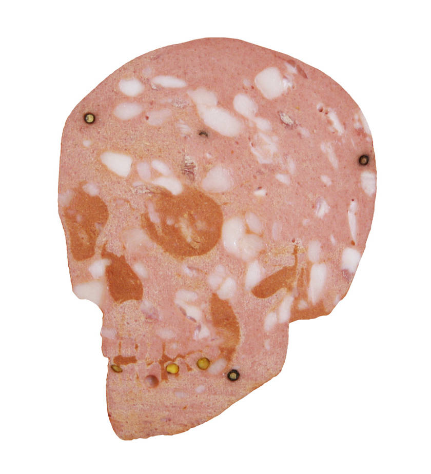 As the title indicates, Mortadella is a work made of recomposed flesh with a drawing of a human skull. The image of the skull has been laser-engraved onto the surface of a real slice of bologna several centimeters thick. Here a bone has been burnished into flesh with a permanent effect, and a slice of Italian deli has been preserved in a laminated photograph under plexiglass.