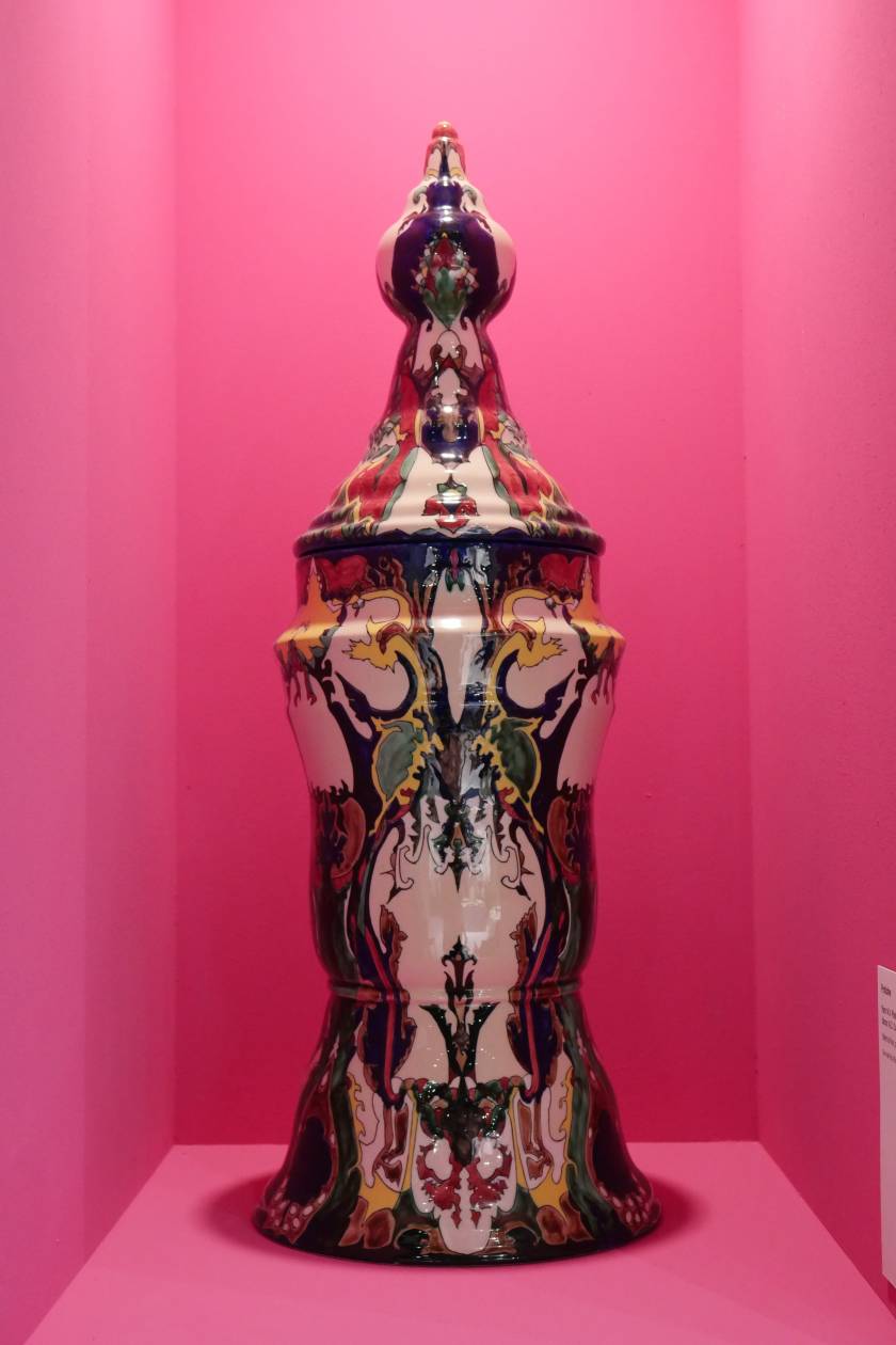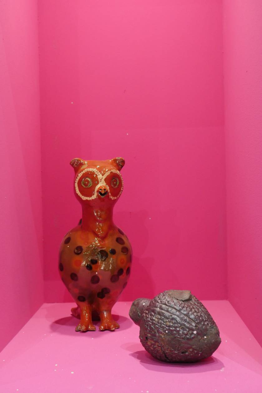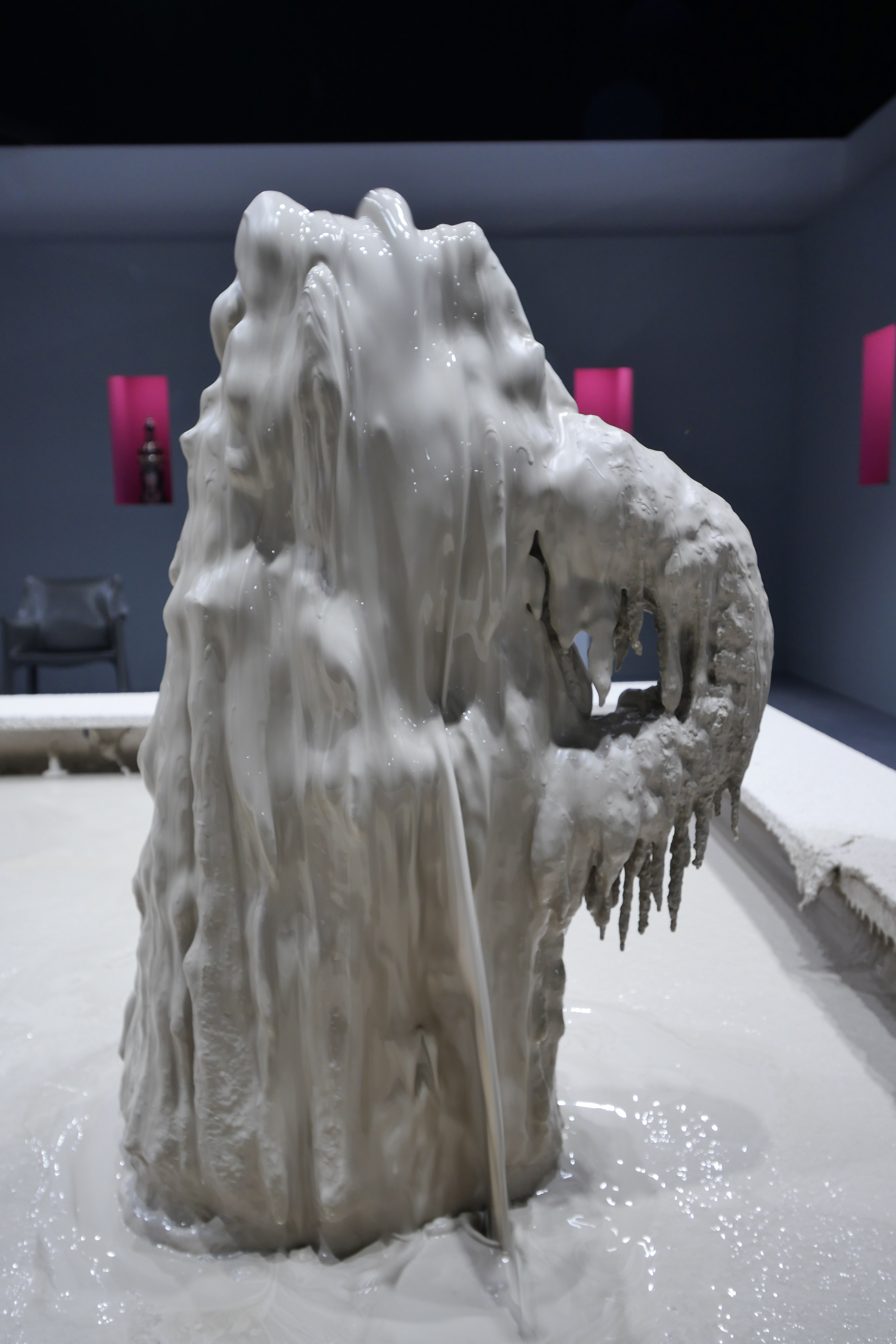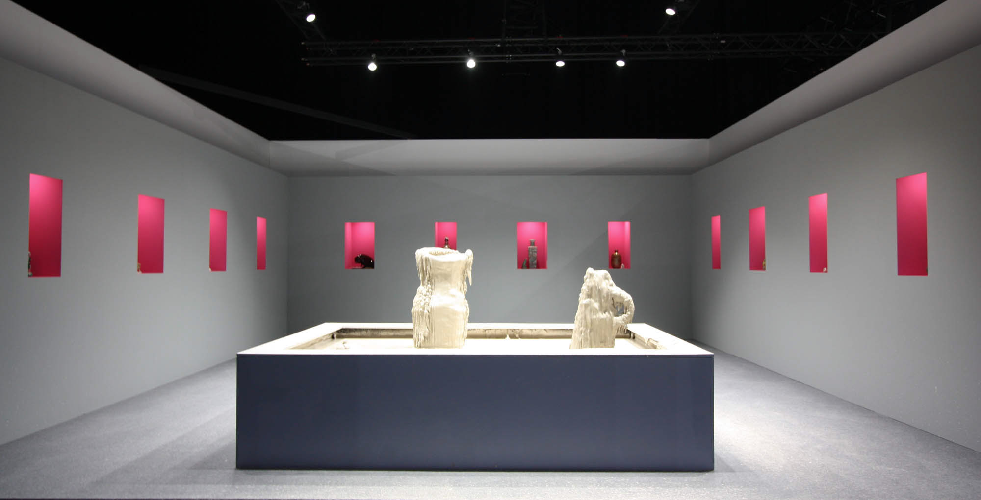 Invited by Ariana Museum to conceive and realize their booth for the contemporary art fair, Artgenève, Christian Gonzenbach selected two dozen of pieces in their archiv and installed them into pink wall boxes. In the center of the booth, a fountain made of porcelain mud spits every few minutes. The liquid clay mades two figures grow, a vase and a jug.