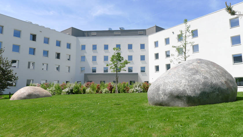 In the courtyard of an apartment complex in Lancy, Switzerland, Neolithes rest. As the winner of a contest to utilize the common space in the new housing project, the artist conflated the past and the present by repurposing the old structural materials from the previous buildings when they were destroyed for the rise of the new ones. The piles of debris (bricks, tiles, etc.) were melded together with concrete and transformed into three monumental pebbles residing peacefully as if in a Zen garden, their sinewy curves counterbalancing the geometric rigors of the surrounding buildings.