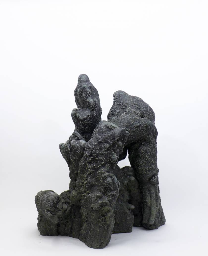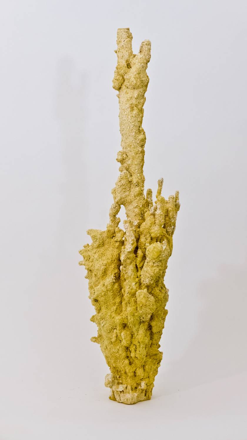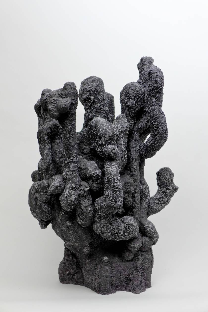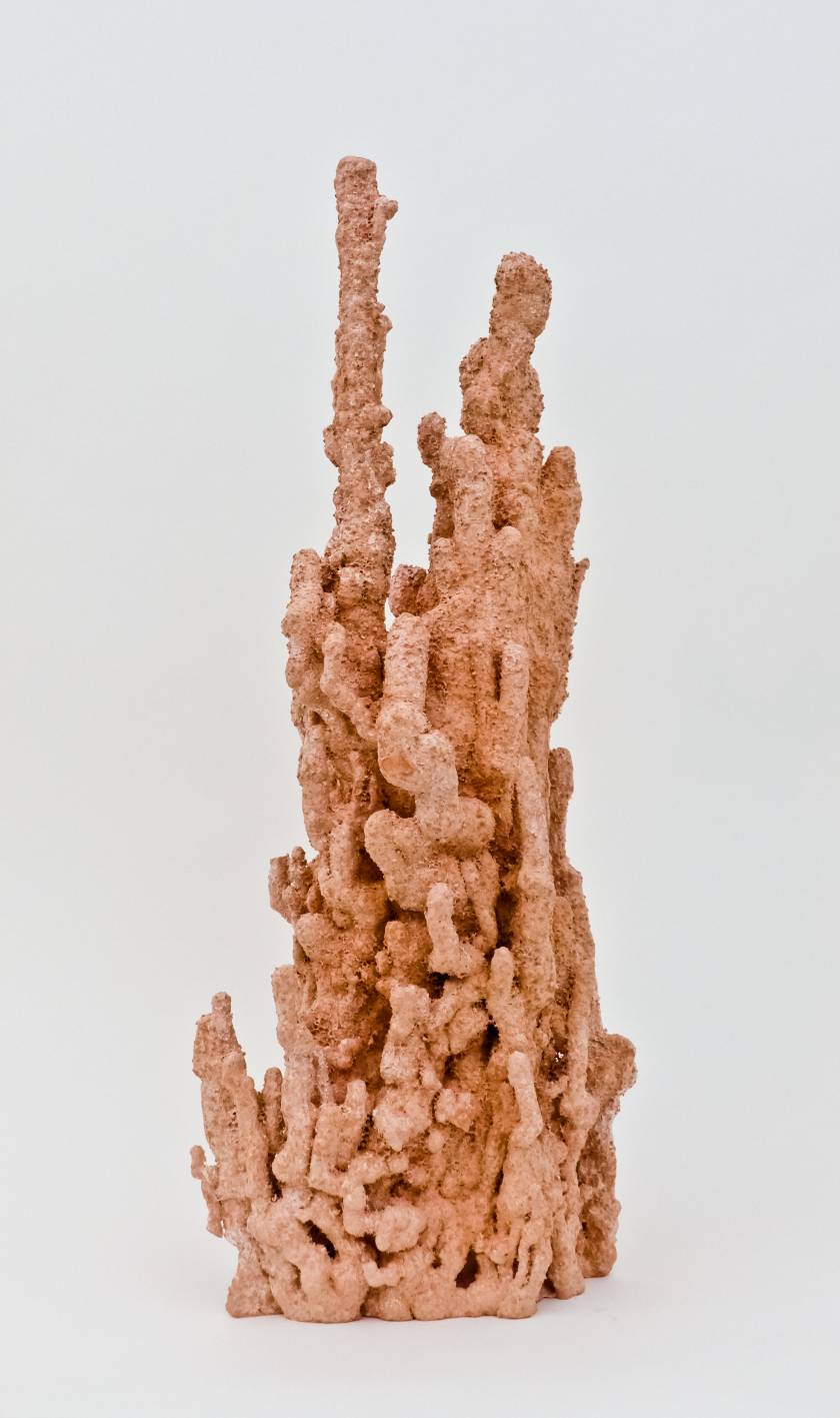 Poursuivant sa quête de l’inversion, l’artiste a creusé des formes en négatif, utilisant des outils incandescents qui forent librement des tunnels dans des blocs de polystyrènes tel des insectes xylophages. Les sculptures sont ensuite réalisées en remplissant ces galeries de béton et en détruisant la gangue de polystyrène. Les formes apparaissent alors, surprenantes, intestines. On est face à des structures d’organes, des stalactites artificielles, des architectures de notre propre intérieur. Elles s’apparentent aux g?ngshí, ces rochers insolites que les lettrés chinois collectionnent et qui selon la tradition auraient grandi sous terre comme des patates pour former ces montagnes miniatures et grotesques propres à la méditation.