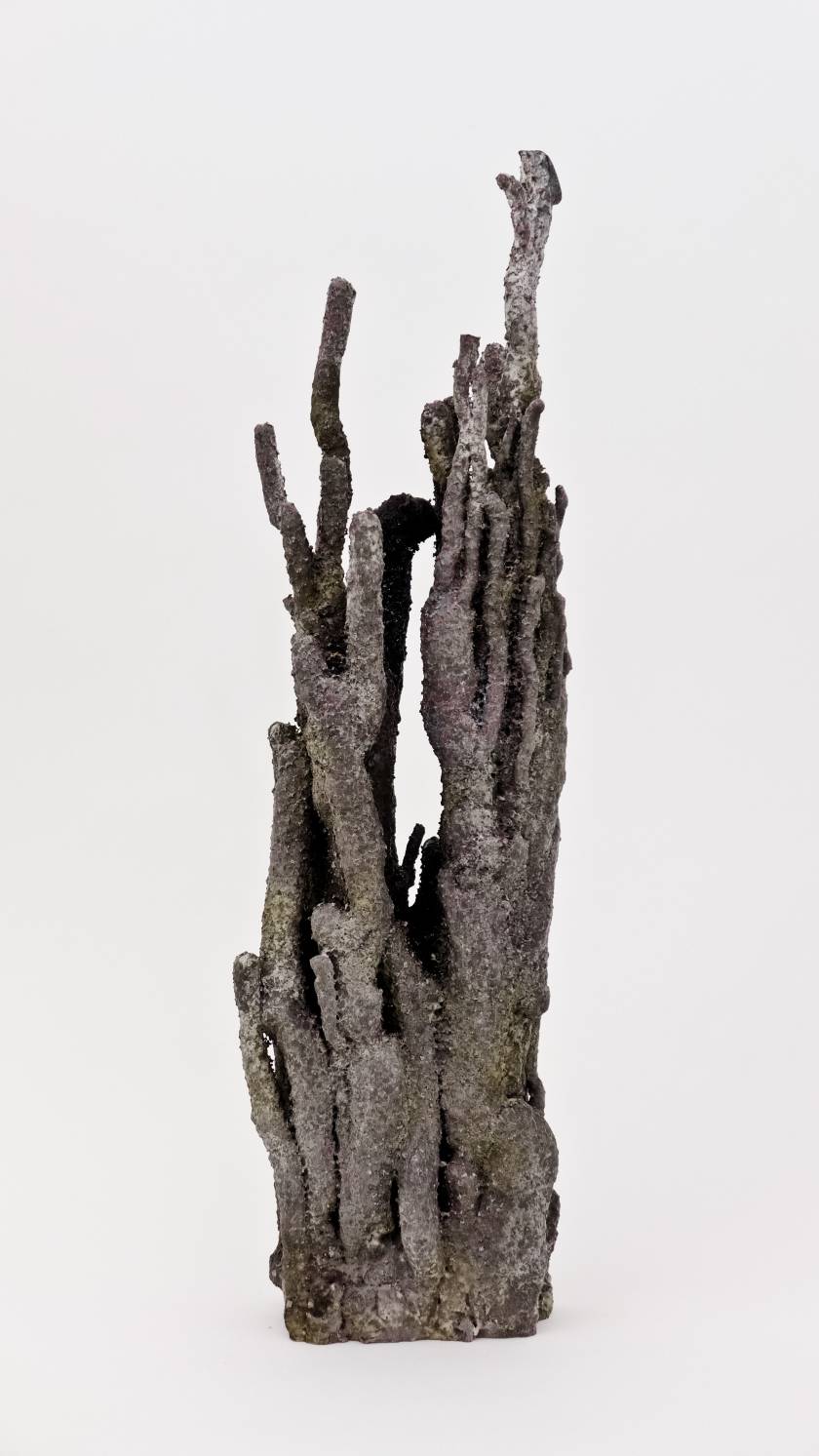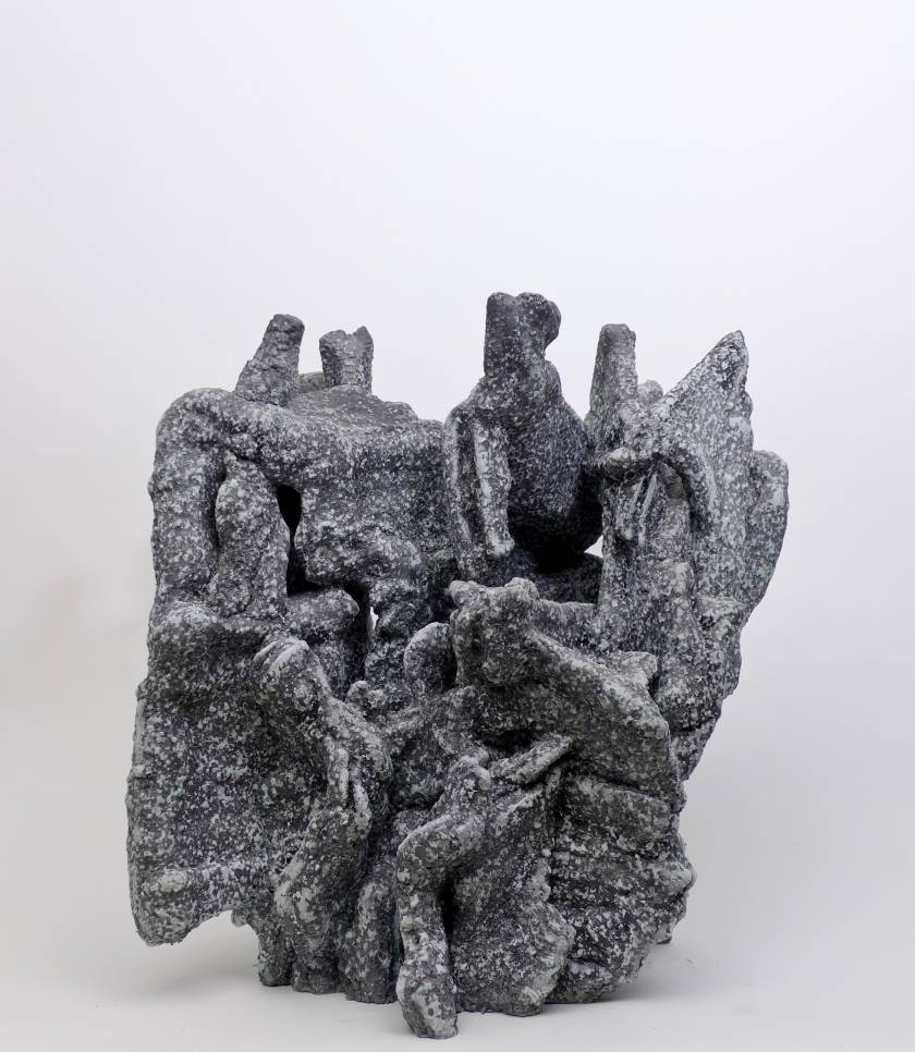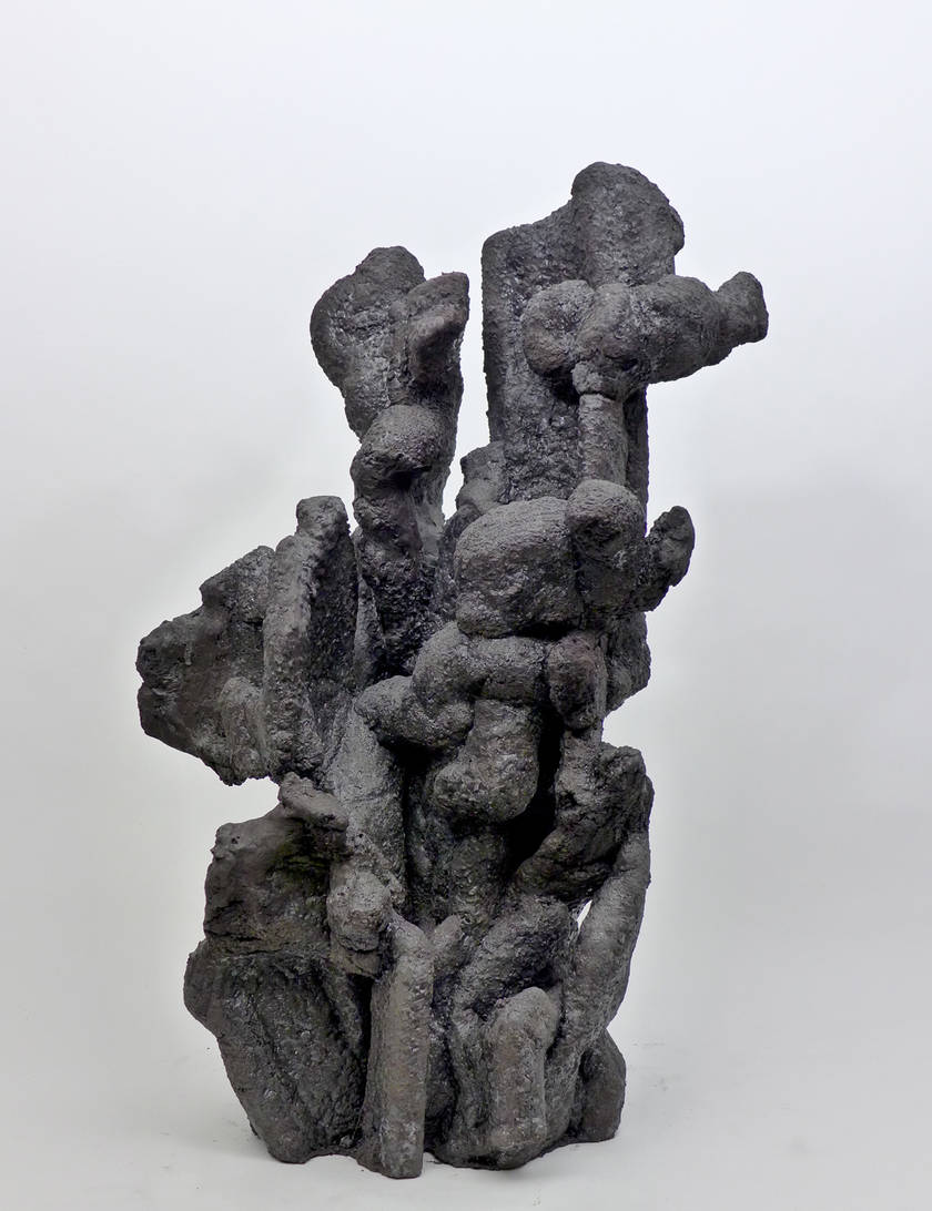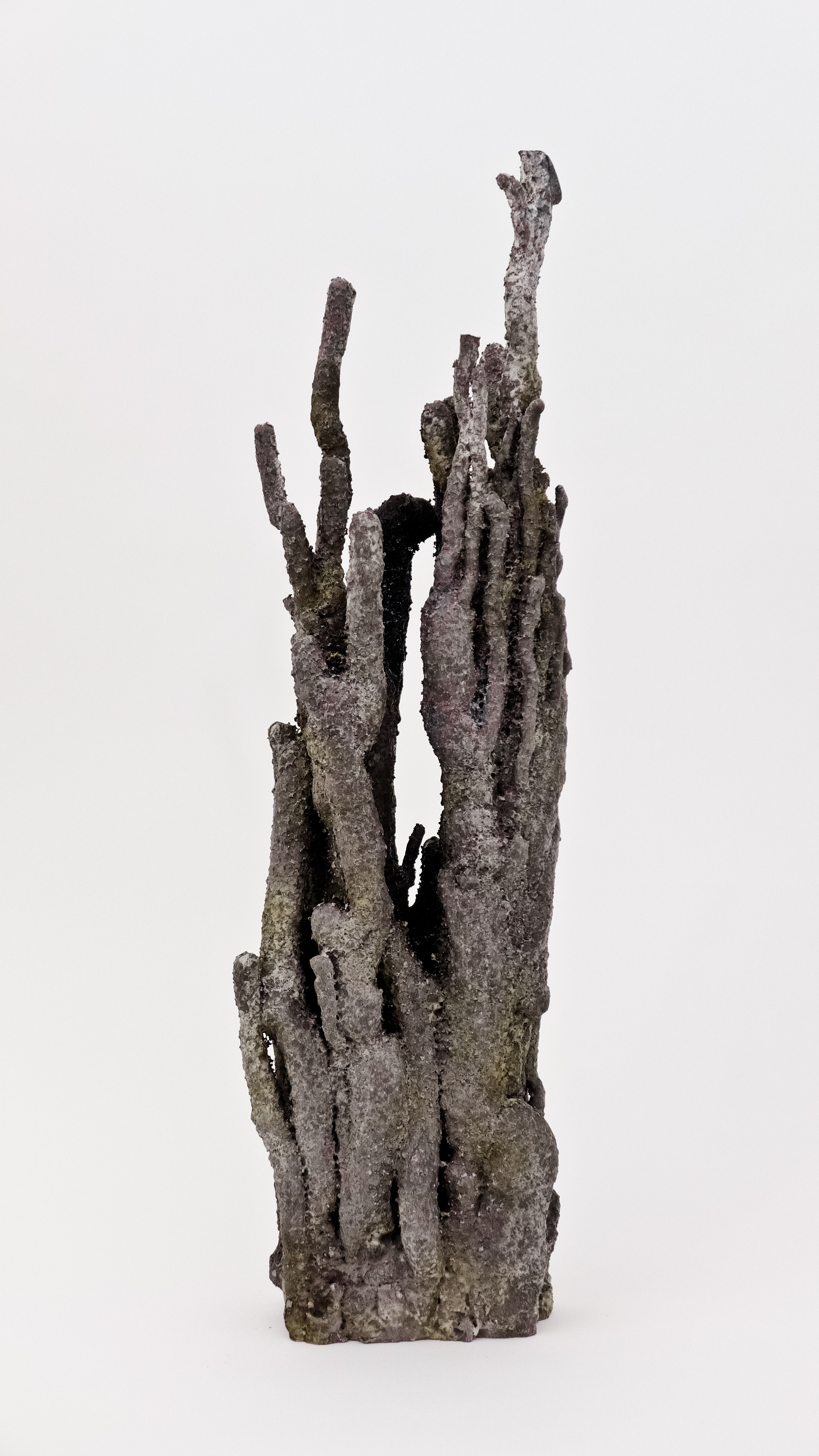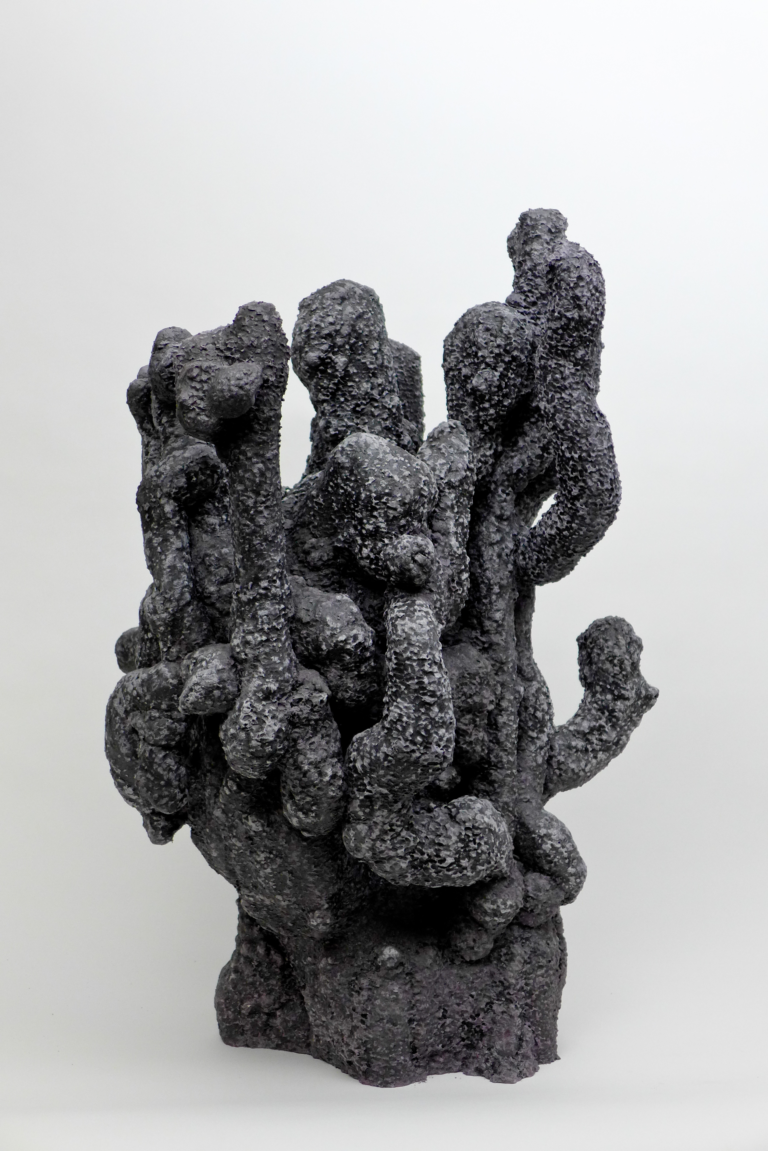 Poursuivant sa quête de l’inversion, l’artiste a creusé des formes en négatif, utilisant des outils incandescents qui forent librement des tunnels dans des blocs de polystyrènes tel des insectes xylophages. Les sculptures sont ensuite réalisées en remplissant ces galeries de béton et en détruisant la gangue de polystyrène. Les formes apparaissent alors, surprenantes, intestines. On est face à des structures d’organes, des stalactites artificielles, des architectures de notre propre intérieur. Elles s’apparentent aux g?ngshí, ces rochers insolites que les lettrés chinois collectionnent et qui selon la tradition auraient grandi sous terre comme des patates pour former ces montagnes miniatures et grotesques propres à la méditation.