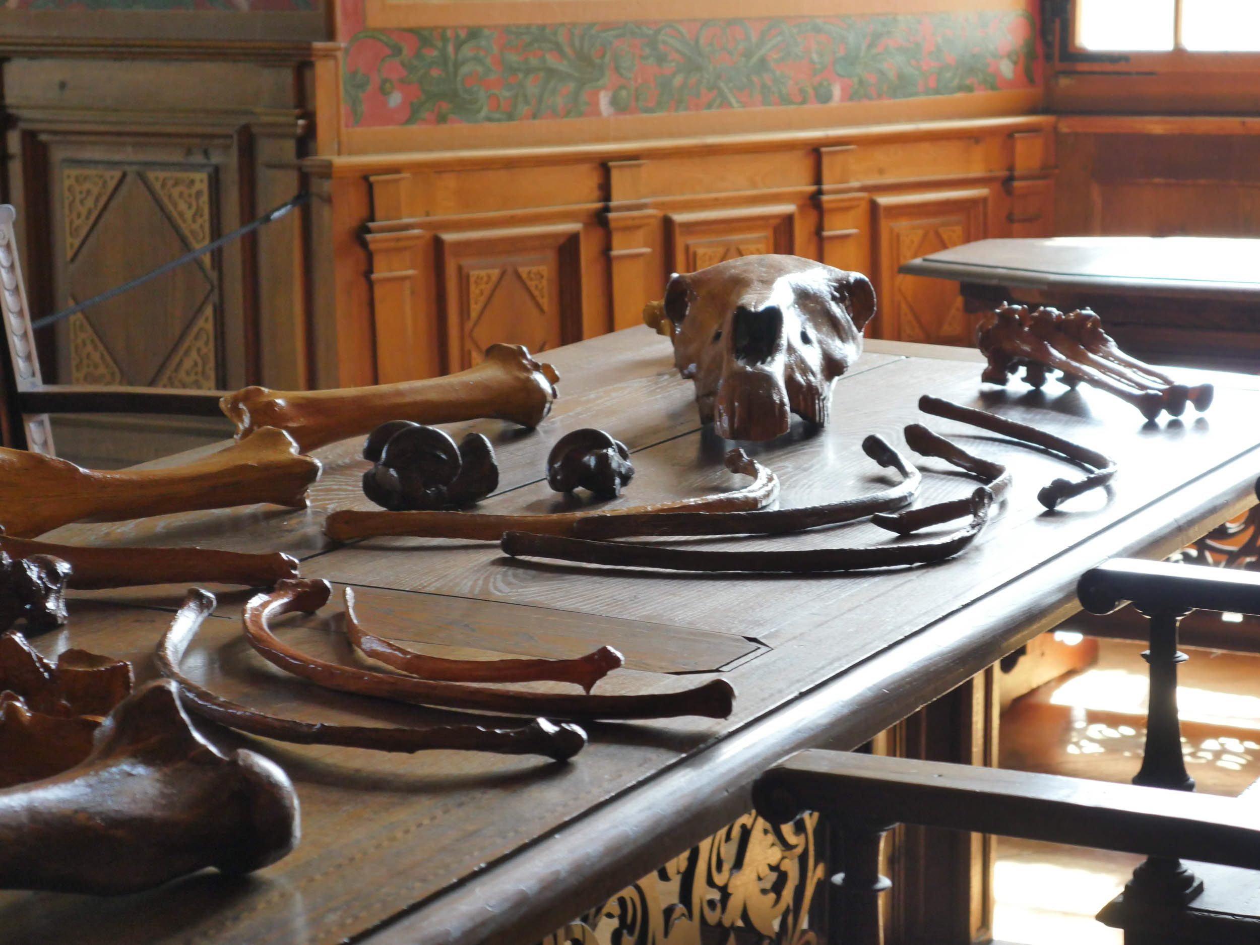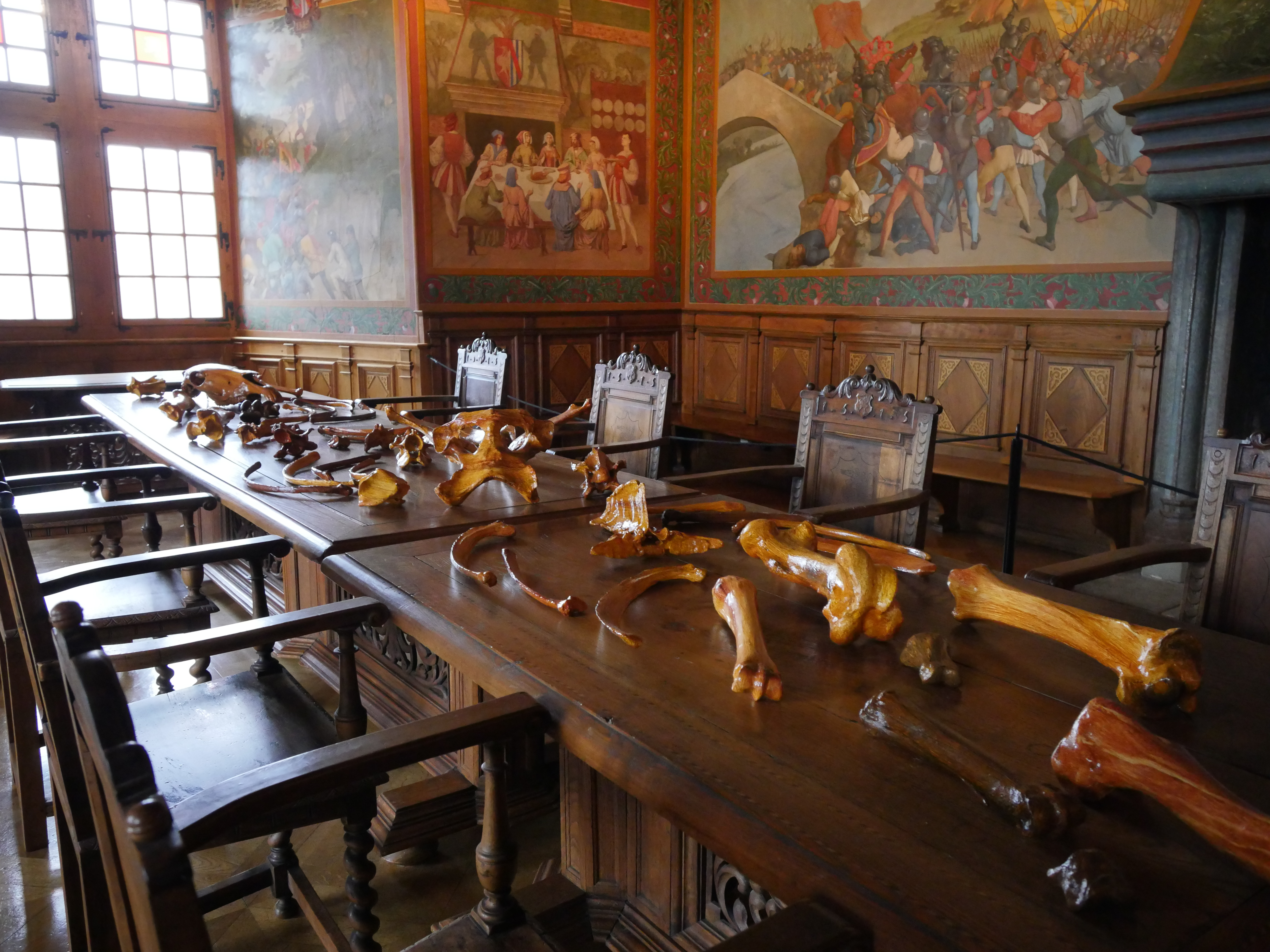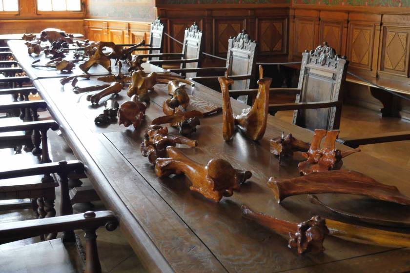 It is actually a real horse skeleton, painted in «faux-bois». All the elements of the story of Troy are present here: the wooden horse, the bones, the remains. And what would have happen if the Trojans would have eaten the wooden horse?