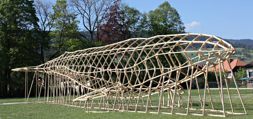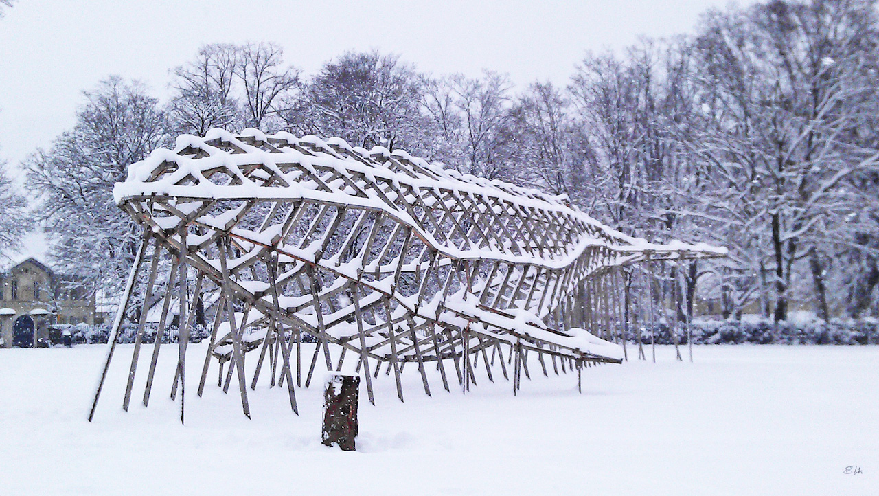 This work is the same as Life Size, however, once installed outdoors, having its gigantic skeletal form filled in by air, the underwater mammal becomes a man-made bird, hence the name Zepplin.