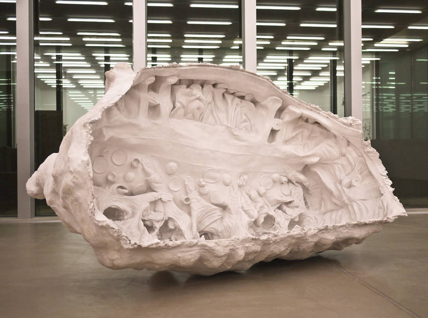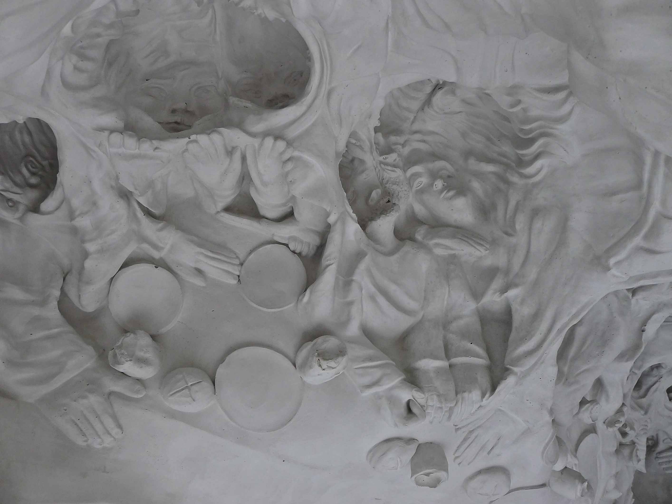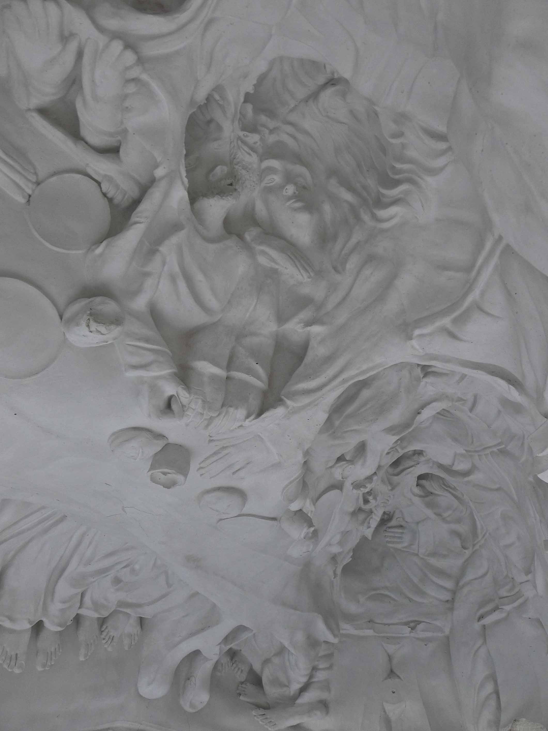 La scène religieuse bien connue de tous, Ultima Cena, a subi quelques modifications après manipulation. D’après une petite sculpture blanche de la Cène, sans qualité plastique aucune, vendue par un magasin de souvenirs, un modèle similaire mais agrandi à une échelle humaine a été réalisé avant d’être moulé. Il en résulte une pièce en négatif, un portrait de groupe complexe, présenté avec tous les défauts résultant d’un agrandissement qui n’aurait pas dû être fait, disposé nonchalamment sur le côté où des détails apparaissent en positif et permettent, mentalement, de saisir, par étapes, la référence iconographique qui a donné lieu à cette pièce.