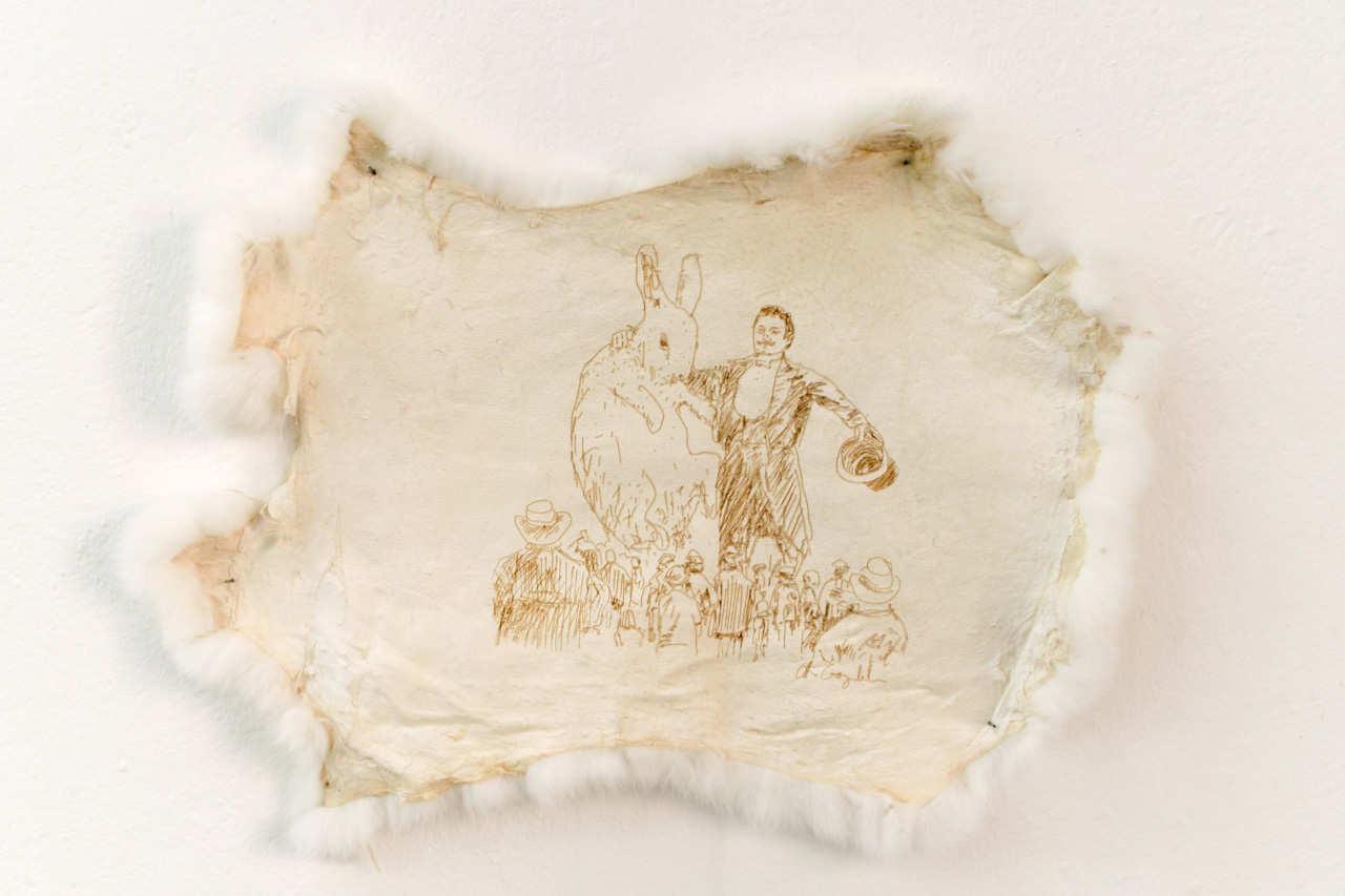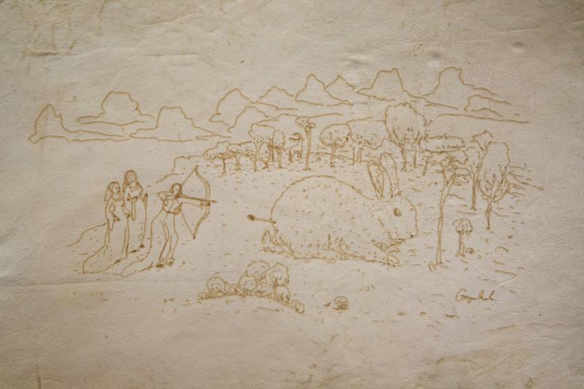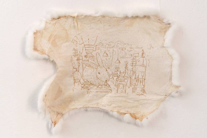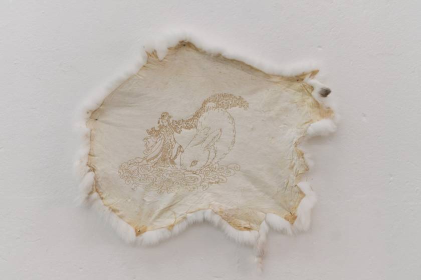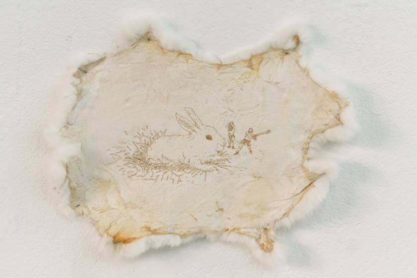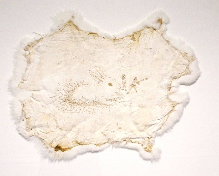 Skintales est une série de dessins gravés sur des peaux de lapin qui, comme tirés d’un conte, racontent les scènes de la vie d’un grand lapin. La narration se découvre comme autant de tatouages qui préexisteraient au dépeçage du gigantesque léporidé. Cette série est en effet indissociable du Great Stuffed Rabbit. Elle est présentée dans un accrochage linéaire et la fourrure blanche qui encadre les peaux contribue à leur donner un petit aspect aérien rêvé.